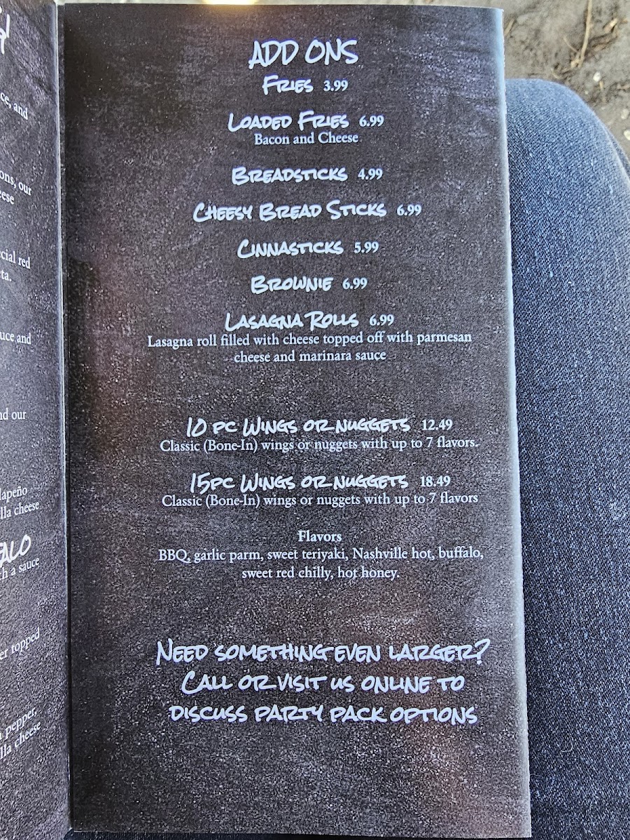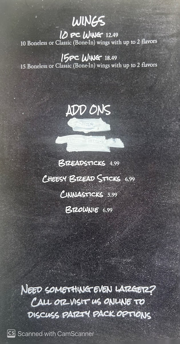 Ten wings. Choose from Buffalo, BBQ, Garlic Parmesan, or Plain. Blue cheese, ranch, or no side sauce.