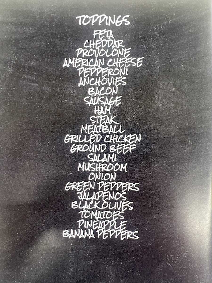Original, pizza cheese, American cheese, green peppers, steak, mushrooms and onion.
