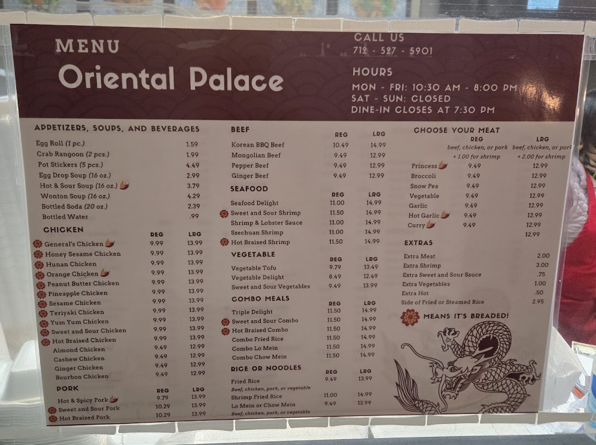 Oriental Palace, located at 9 1/2 N Vine St, Glenwood, IA 51534, United States, is a restaurant reviewed by 116 users. It sees peak wait times of up to 15 minutes from early afternoon until the evening most days of the week, signaling a steady flow of customers. The Crab Rangoon is one of its standout dishes, suggesting a menu influenced by Asian cuisine that includes popular appetizers.