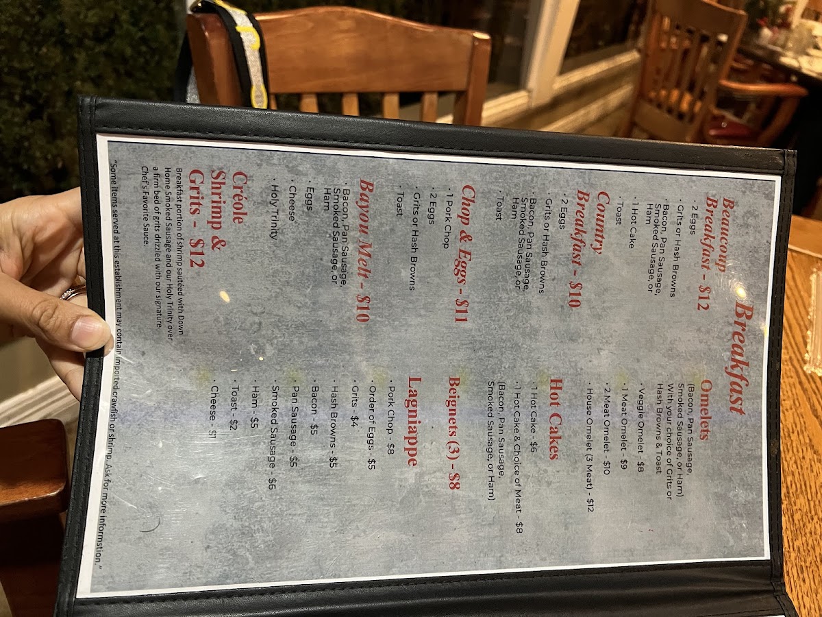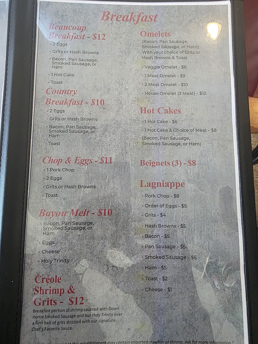 Breakfast portion of shrimp sautéed with down home smoked sausage and our holy trinity over a firm bed of grits drizzled with our signature chef's favorite sauce.