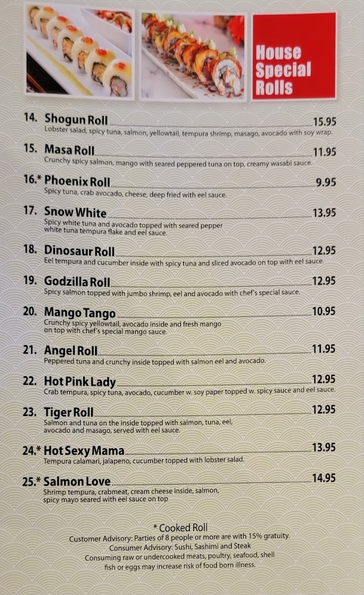 Tuna, salmon, crab, white fish, avocado roll w. sliced cucumber in sweet vinegar.
