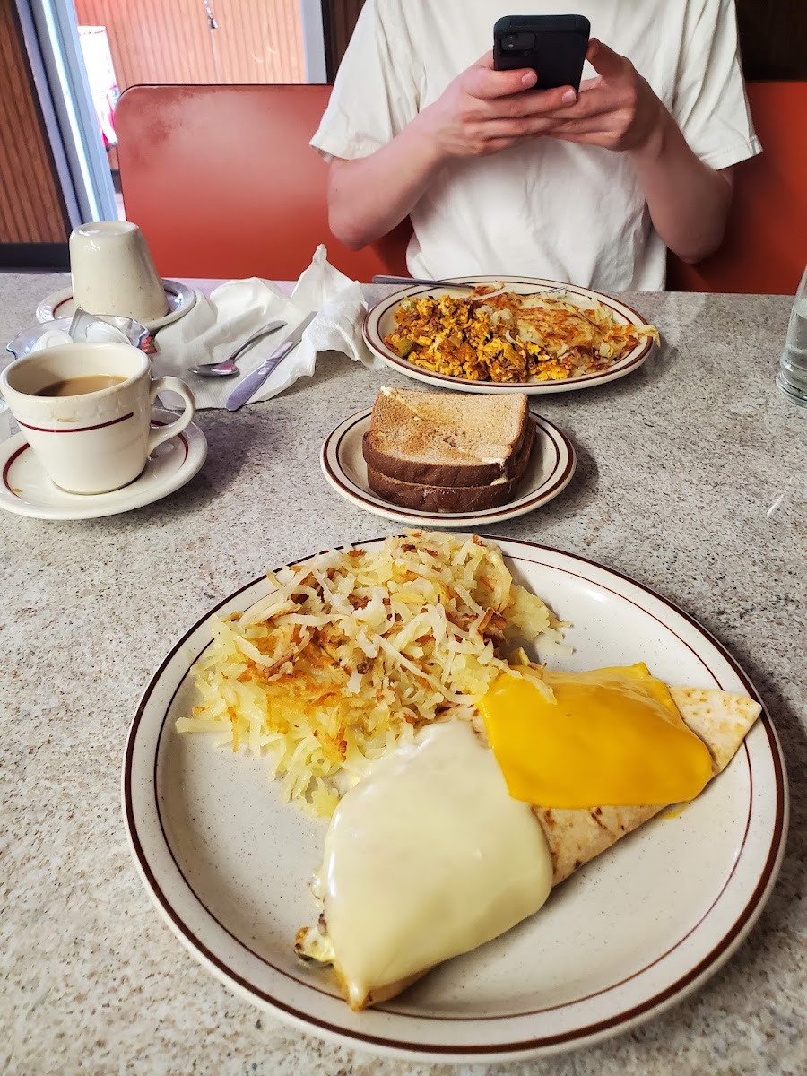 We got the breakfast special.It was awesome!Food was tasty fresh ingredients and coffee included until 11.Cups of butter here(no digging my butter out of those little plastic things wondering how old they are).Waiteress very friendly and helpful.I love the decor very clean.We are definitely going back . And that selection of pie!! Can't wait to go back