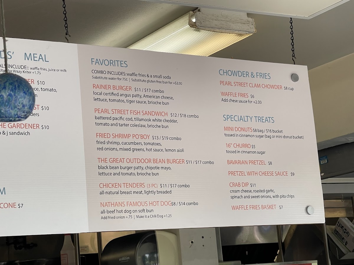 Pearl Street Sea Grill is a restaurant located at 8F3J+M3, Tacoma, WA 98407, United States, with a modest total of 6 user reviews. The menu features dishes like Waffle Fries Basket, Crab Dip, Pretzel With Cheese Sauce, Bavarian Pretzel, and a 16" Churro. Visitors to this establishment enjoy no wait times throughout the week, ensuring prompt service from Monday through Sunday. This relaxed spot offers a variety of creative appetizers and snacks, perfect for casual dining or sharing with friends in a coastal town setting.