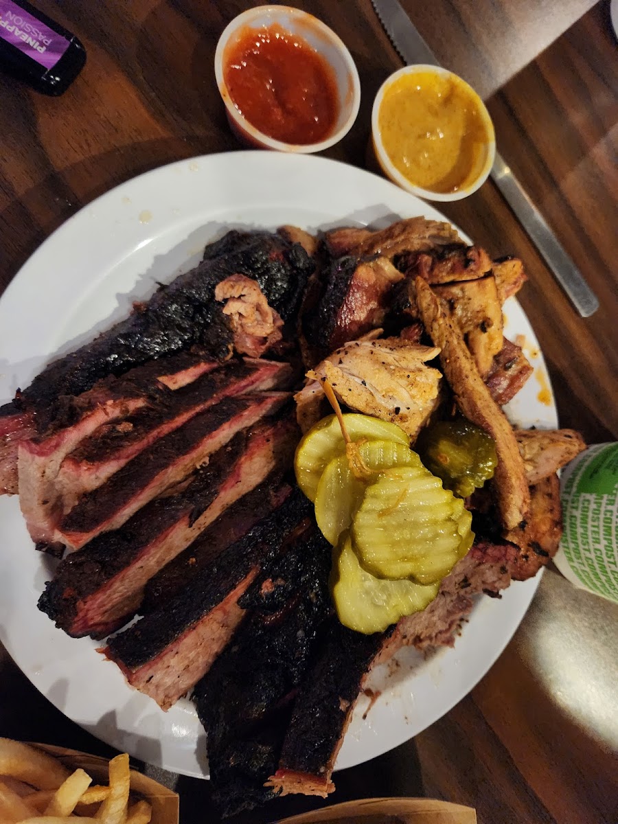 Nice local spot. Fully stocked bar. Brisket Nachos was huge and tasty. Good as a shareable dish. Barbecue is available Thursdays until they run out around Saturday.
