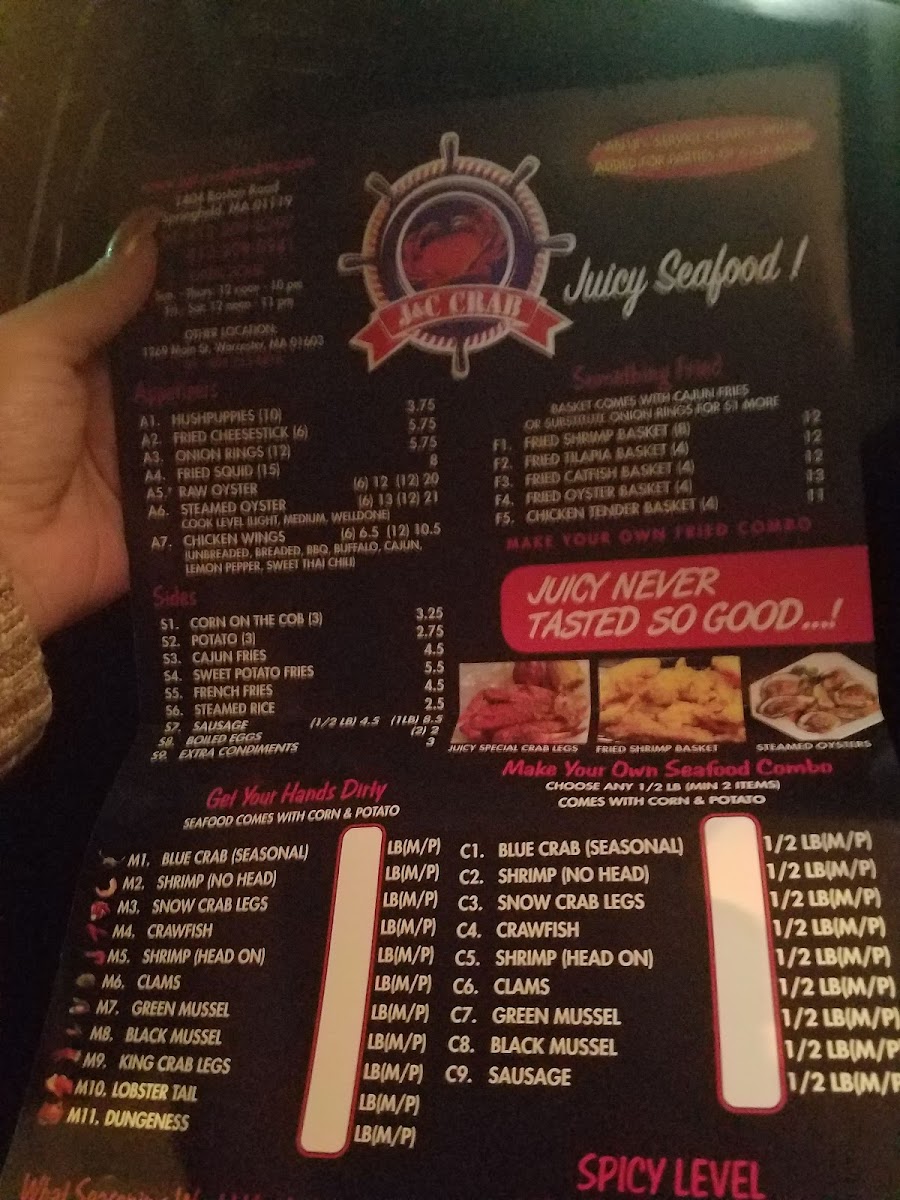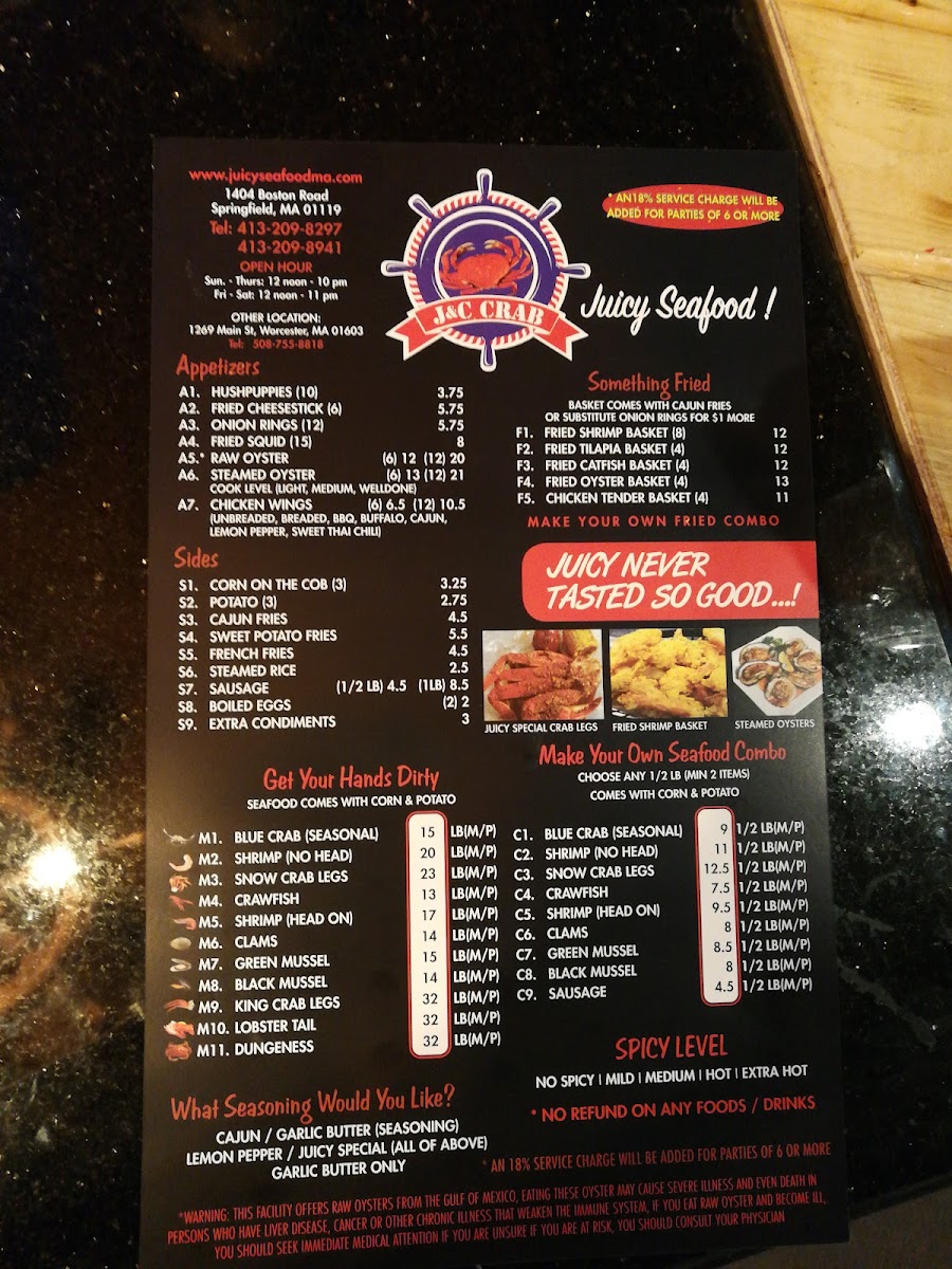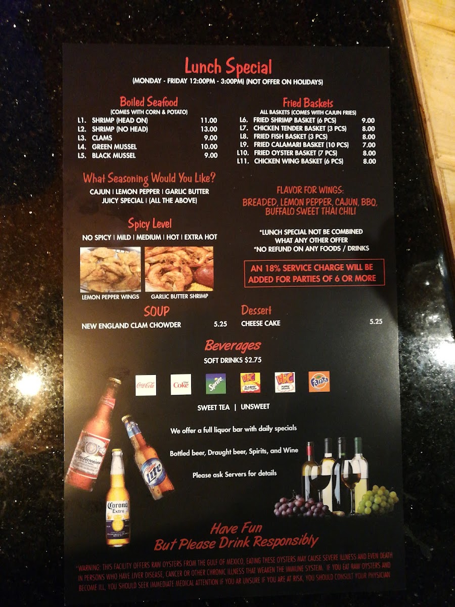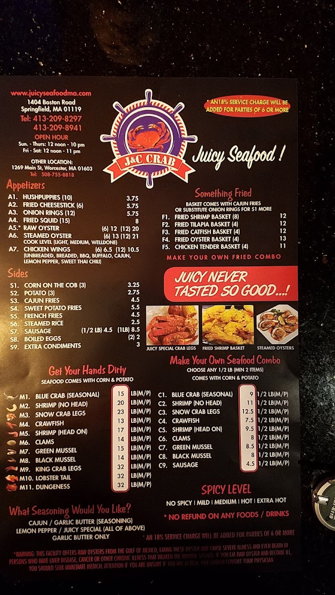 Your choice of light, medium, or well done. Your choice of the sauce: juicy, Cajun, garlic butter seasoning, lemon pepper, and garlic butter only. Your choice of spicy level: no spicy, mild, medium, hot, or extra hot.