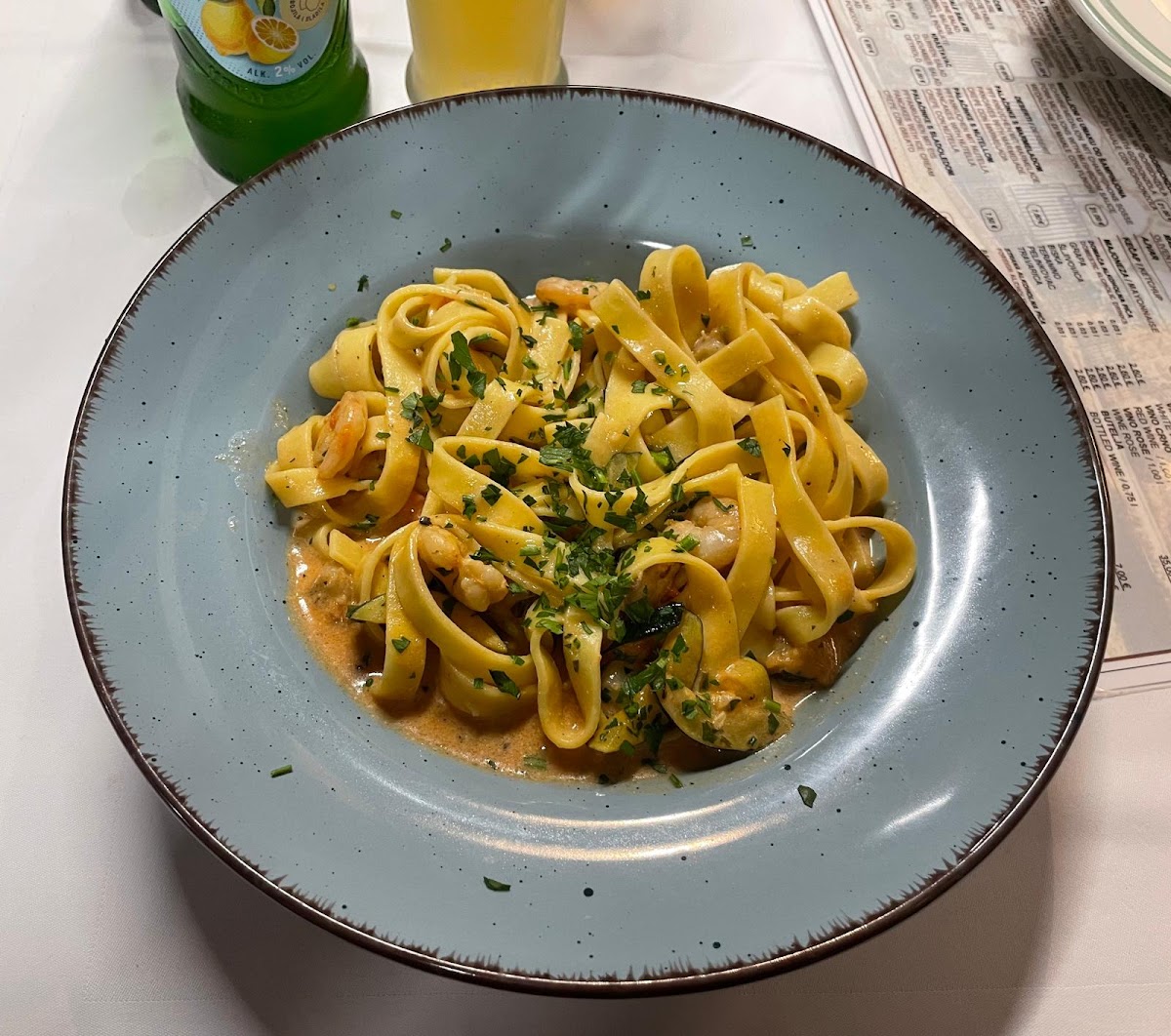 Food was great. Sea bass was amazing - right amount of salt and perfectly grilled. We got boiled potatoes and spinach on the side, and that was very good. The seafood pasta is normally served as a spaghetti but we asked if it’s possible to change to tagliatelle out of personal preference and they kindly did for us. The service was also good. 3 stars for atmosphere because the men’s toilet smelled horrible but maybe it was just that day.