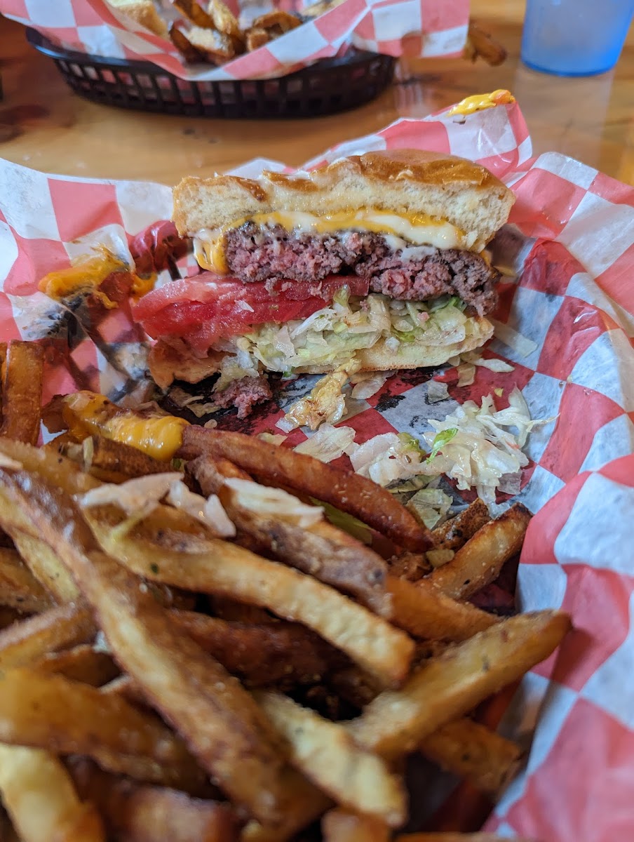 We were passing through and stopped for dinner. Had great burgers and nicely done french fries. I had Dougie's burger... mac n cheese, bacon, nacho cheese, fried onions, BBQ sauce. Odd combo but very tasty