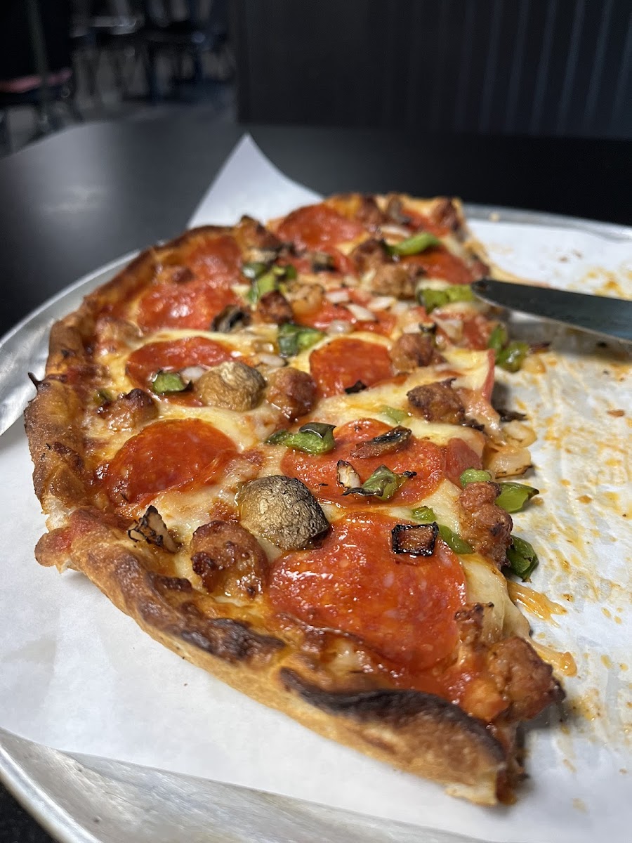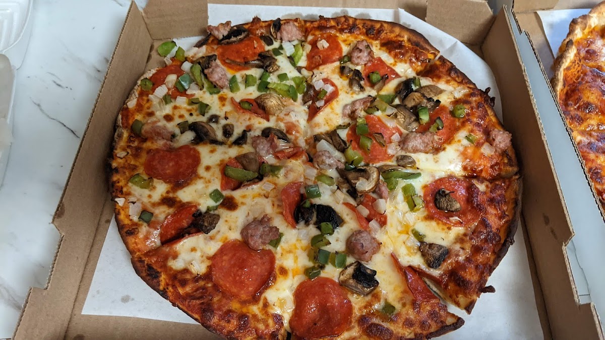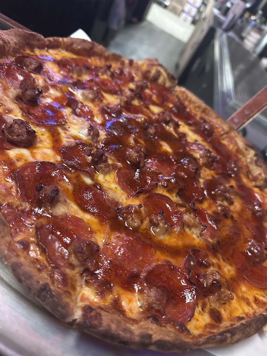 Very busy! Great pizza and service. We tried a pepperoni/sausage, the supreme and sauerkraut balls. All excellent.