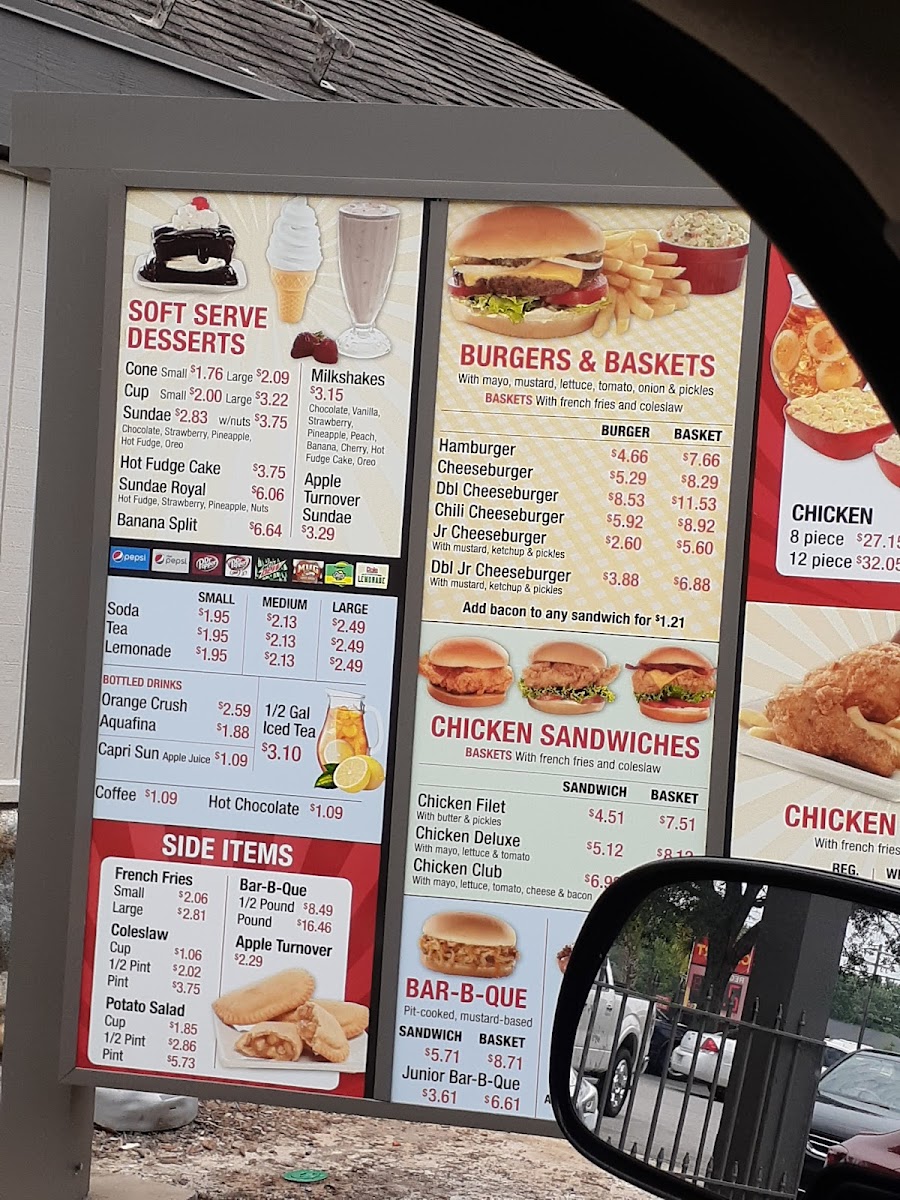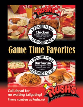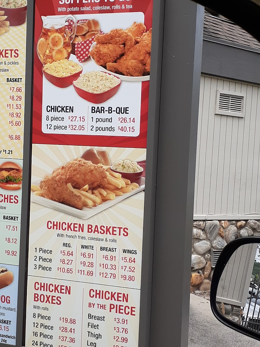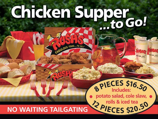 Includes chicken, a pint of coleslaw, a pint of potato salad, rolls, and a half gallon of tea
