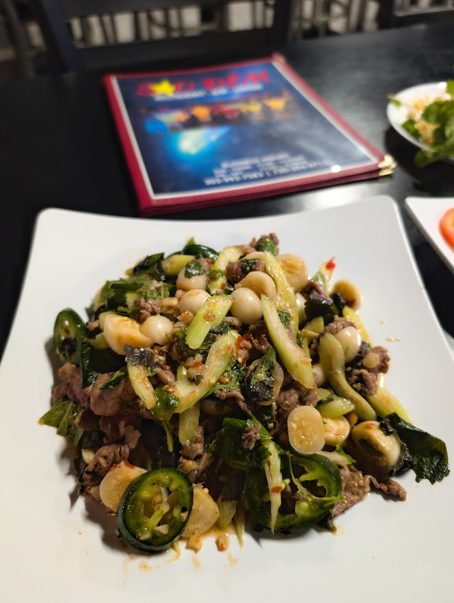 I really enjoyed the food and the huge screen with the Sunday night football game on. I had the beef and eggplant salad, which was fresh, delicious and a new flavor profile for me that I enjoyed! I also got the shaking beef and the bun bo hue. Both were very good. The Bun Bo Hue had a buttery taste to the broth that I really enjoyed. I had one issue, and I know it may be a cultural thing, but people were smoking Joes in the corridor between the first door you walk through and the main door. So as you are walking into the restaurant, it smelled like a smoking ashtray. Not a great first impression when walking into a restaurant imo. I hope it was just because it was a Sunday night and I was the only person there eating. Pricing was extremely reasonable and the people were all very friendly.
