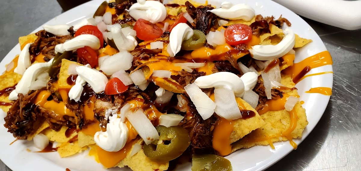 My wife and I stopped by for lunch. I had the pulled pork nachos and my wife had the pulled pork sandwich and a salad. The food was excellent and the service was great. Wed definitely eat here again when we are in the area.