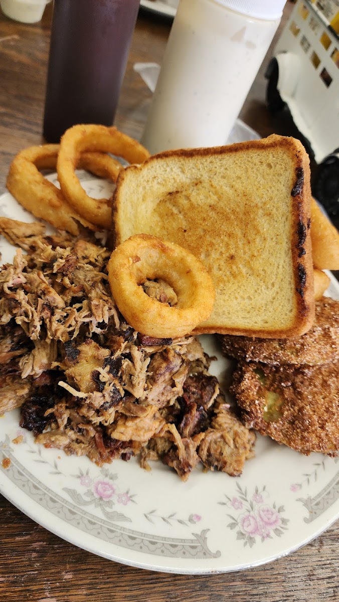 They exceeded all expectations. Food was homemade and expertly cooked. Pork was moist and rich with flavors. Bbq sauce was sweet, great taste if you like sweet sauce. Fried Green tomatoes had a cornmeal mix that worked very well paired with ranch. Onion rings were beer battered and yummy. Bbq beans were sooooo good. Prices fair and service was top notch. Thank you!