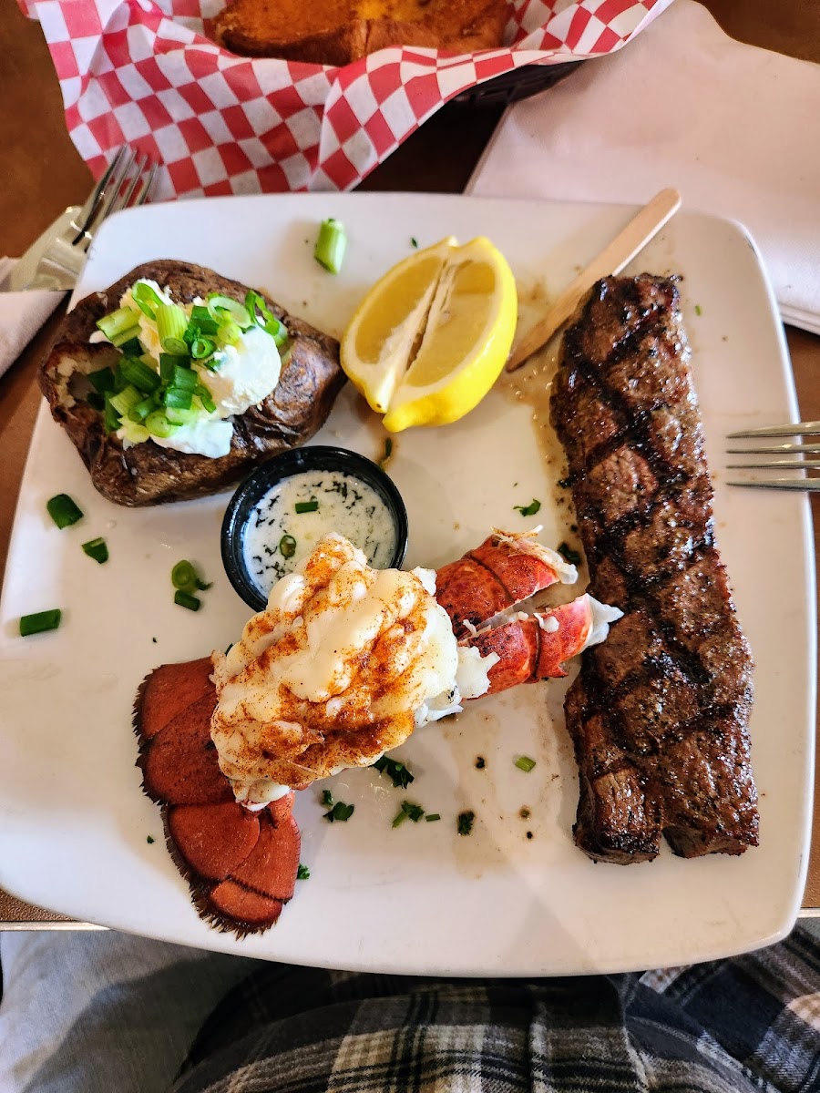I ordered the steak and lobster with baked potato on a Friday night. The food arrived about 10 minutes after I sat down. The steak was cooked medium well and delicious, as was the lobster. The baked potato was average. Freddie my server was very attentive and kept and was very friendly. I will definitely come back soon.