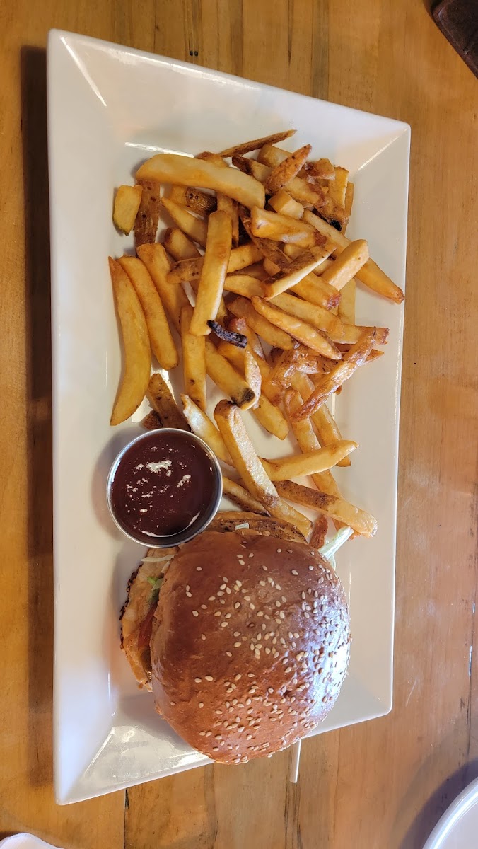 What a nice bar and grill restaurant. Fun atmosphere with a sports vibe. Truly and incredibly inclusive menu with gluten free and plant based menus and regular food offerings. I'm a small eater and they happily accommodated my request for a half order of the excellent beef brisket. The half order was very generous and more than I could finish. Sydney was our cheerful and helpful server. She warned my husband that the hot chicken sandwich was very spicy. He loved it and ate every bite. It was a very enjoyable dinner for two weary travelers.