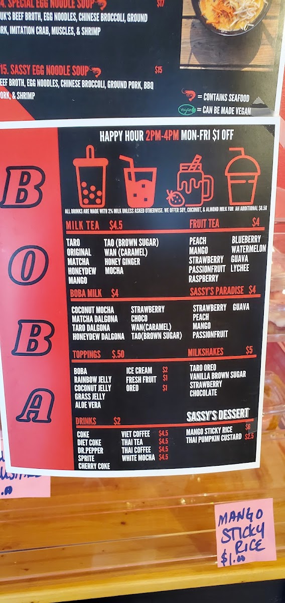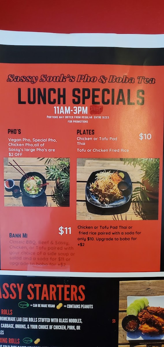 (Vegan = Can be Made Vegan) Fresh pieces paper rolls with your protein of choice, vermicelli noodles, lettuce, carrots, cucumbers, bean sprouts & fresh cilantro (served with our Sassy's peanut sauce).