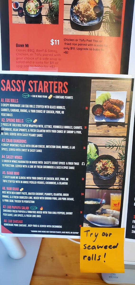(Vegan = Can be Made Vegan) Freshly hand rolled pieces. Enjoy these tasty Seaweed rolls, stuffed with red cabbage, carrots, cucumbers, lettuce, & rice paper and choice of proteins (served with Sassy's in-house special green sauce).