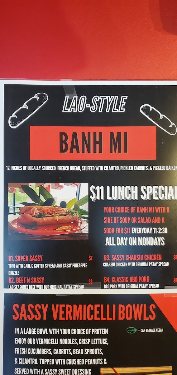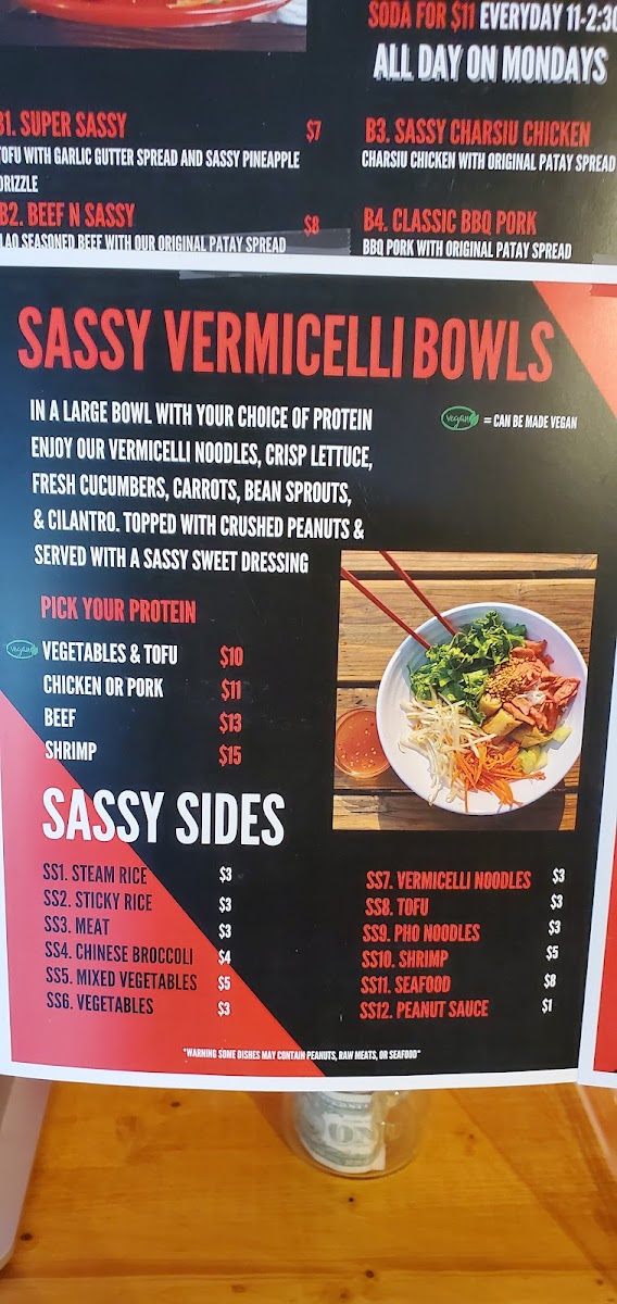 Fresh pieces paper rolls with your protein of choice, vermicelli noodles, lettuce, carrots, cucumbers, bean sprouts & fresh cilantro (served with our Sassy's peanut sauce).