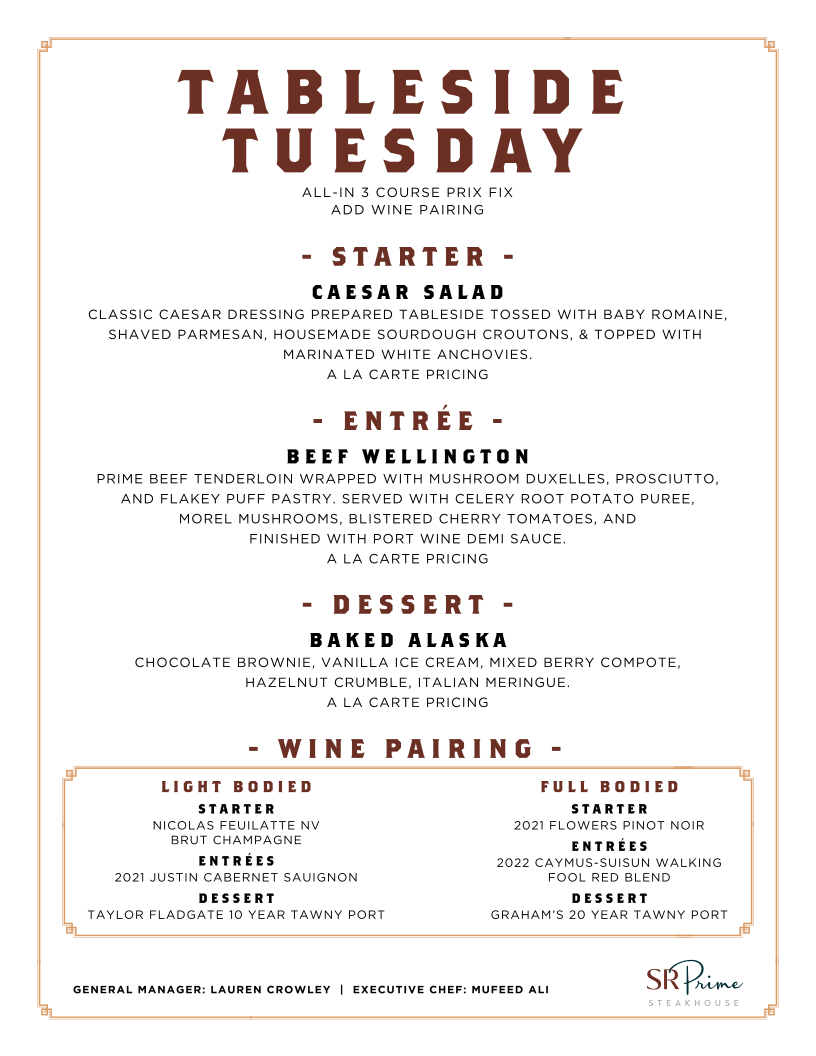 CLASSIC CAESAR DRESSING PREPARED TABLESIDE TOSSED WITH BABY ROMAINE, SHAVED PARMESAN, HOUSEMADE SOURDOUGH CROUTONS, & TOPPED WITH MARINATED WHITE ANCHOVIES.