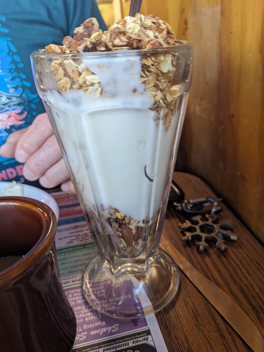 I've been wanting to try this restaurant since I saw their breakfast specials about two years ago online. I finally decided we needed a change from our breakfast routine. The menu is truly unique for this area , service was fantastic, prices extremely fair and the atmosphere is very comfortable. Definitely will stop again ! This was a Turtle Crepe my son ordered, it was a work of art and he was very pleased . Can't beat small town dining !!