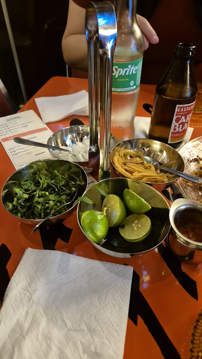 Don’t be scared by the long line. The food was worth the wait and the line went quickly. We had the mixed taco plate (Trompo Orden Mixta) to sample the different typles of meat cooked on the vertical spinning spit. Add onion, cilantro, lime and salsa…wonderful! My favorite was surprisingly the carne asada because I thought it would be the negro fuego based on other reviews. The Tijuanita and the Bistec con Tuetano (bone marrow) were all delicious as well. The mezcalita options were also delightful (we had guava and tamarind). All in all a great experience!