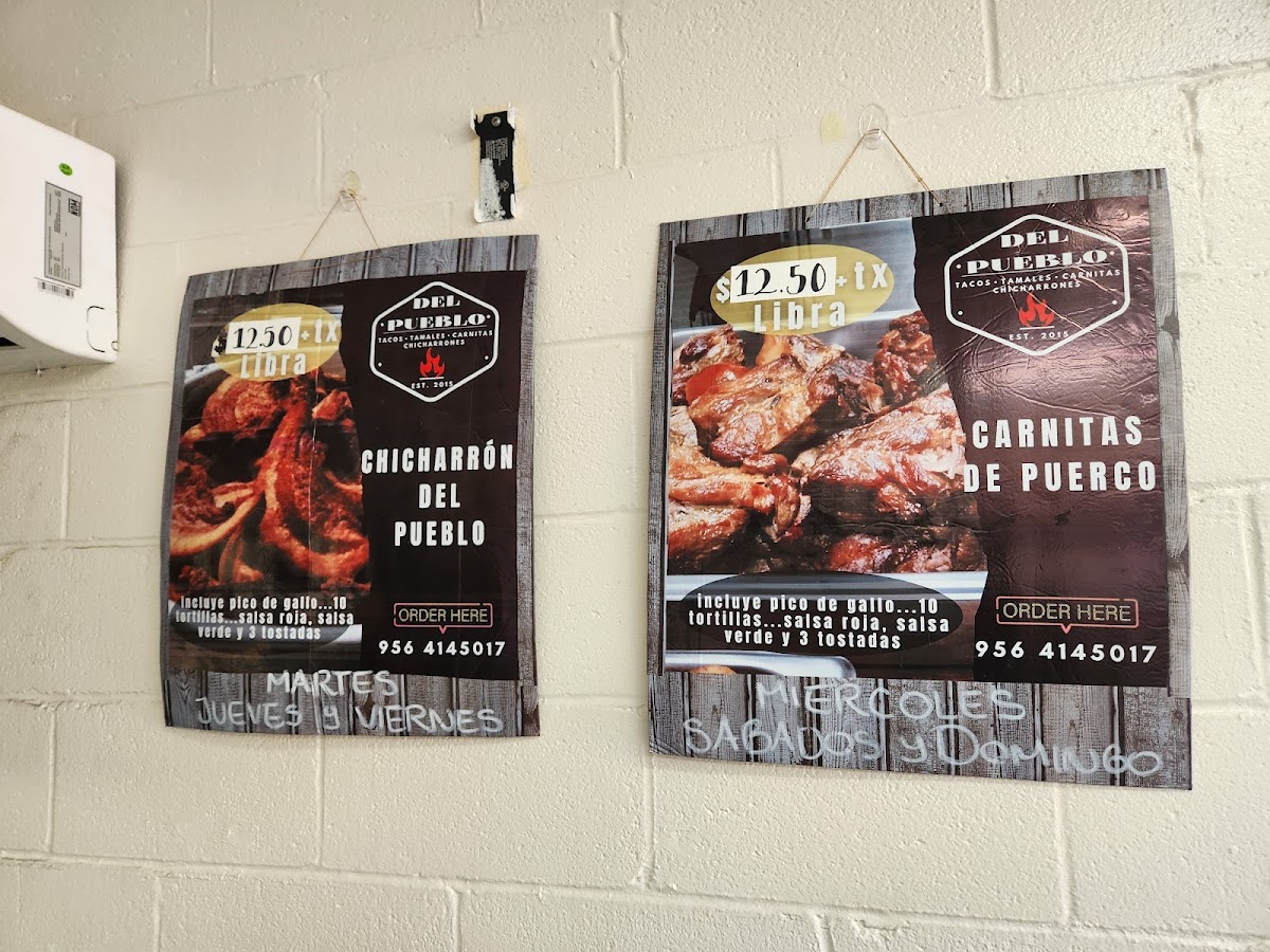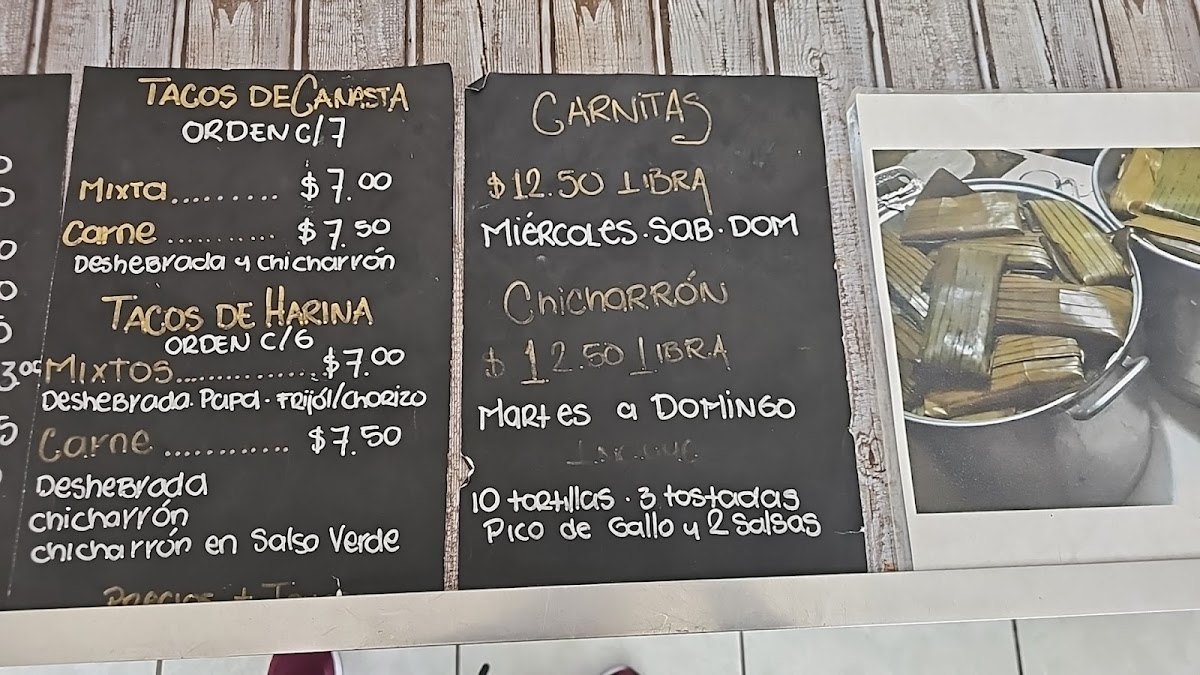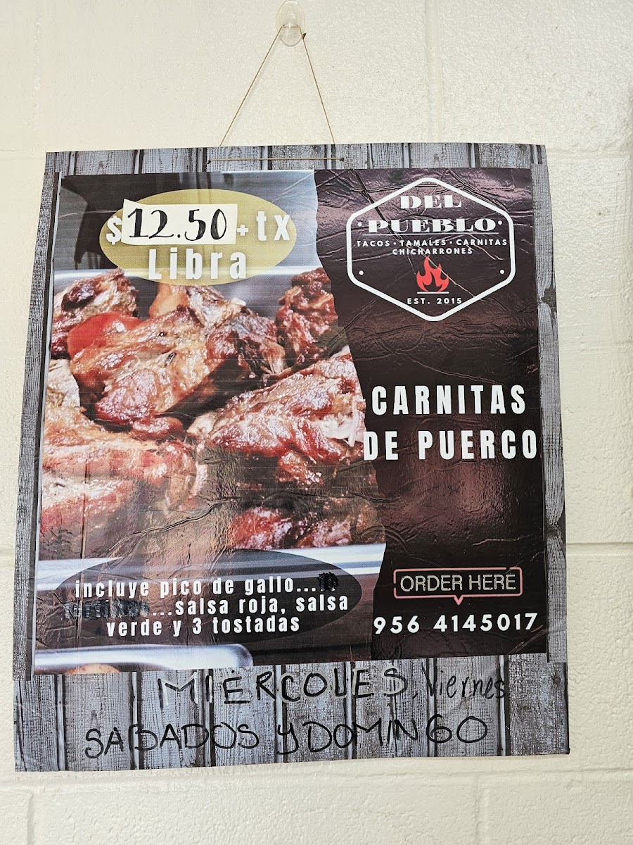 1 LB de carnitas, cuatro tostadas, 5 tortillas, picode de gallo y salsas por 11$... Este platillo solo esta disponible los Miercoles , Sabados y Domingos!!!