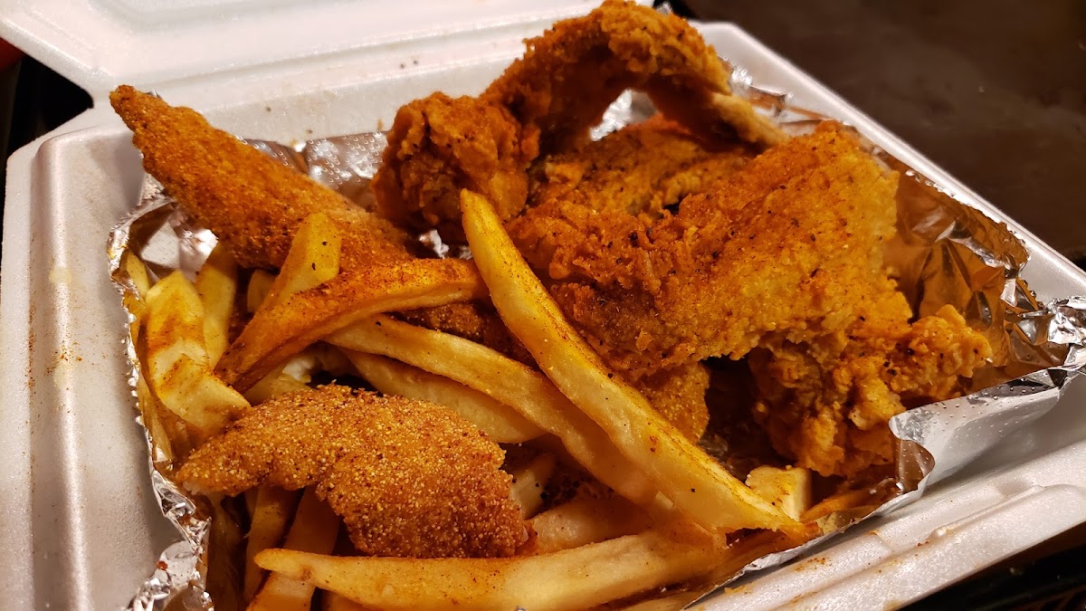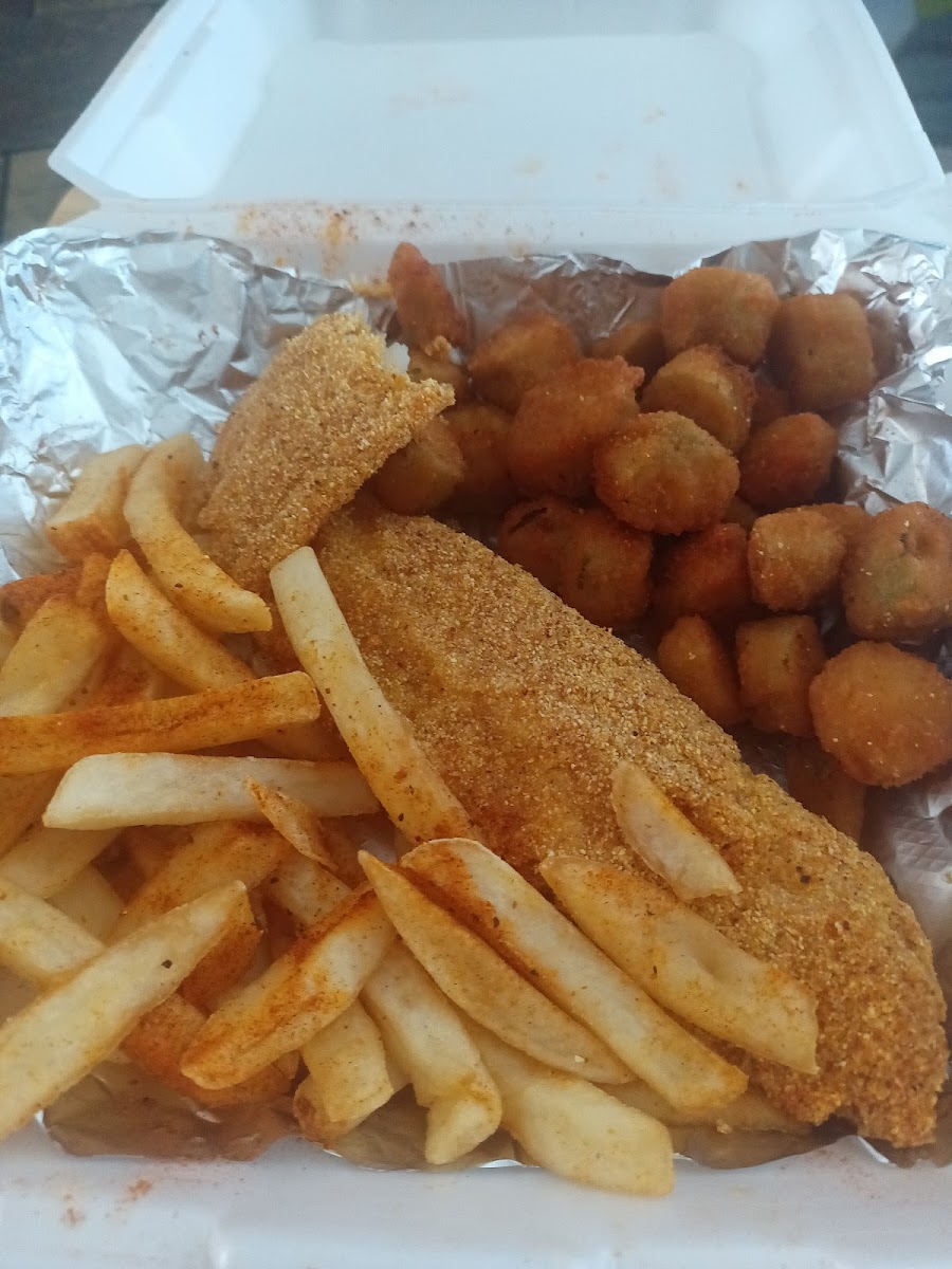 OMG!!! This small hole in the wall has the best fried catfish ever!! I drive past this place daily and decided to stop for lunch. Carryout only as place is super small, but don't worry the food when I got home was still hot and so good. Catfish came with fries and okra Catfish perfectly cooked and flaky. He even put his secret sauce for me to try..so good. Go check this place out. I think I will try the cheeseburger next!!