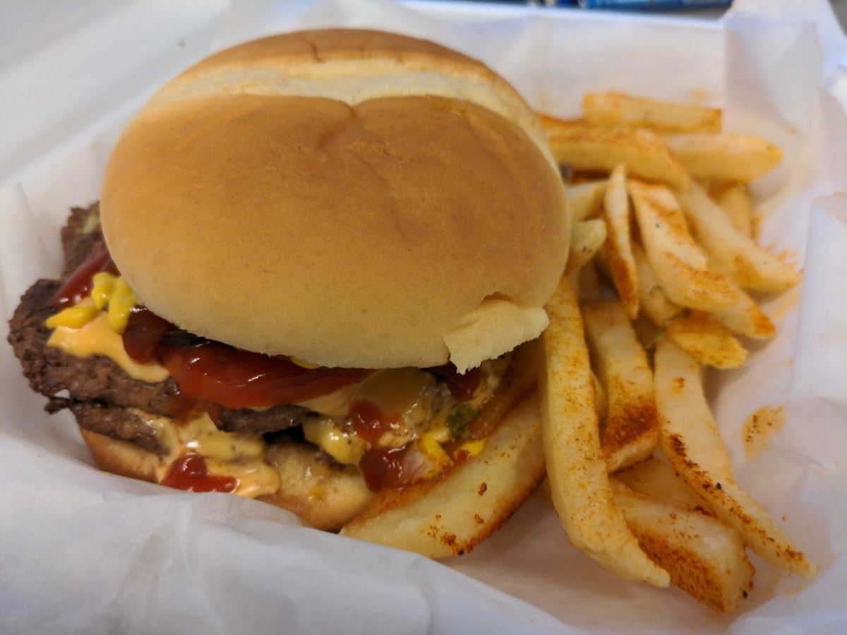 Wonderful service! And now a new favorite. I had a double cheeseburger and received a kind warning that it would require two hands to consume! This was a large burger with fresh veggies made right in front of me. And I was reminded of sitting and waiting as a child while my grandfather grilled burgers. This reminded me of those times. Well balanced not over salted like many fast food chains. Well seasoned and a nice cajon seasoning on the fries. My next Trip I'm going for that Okra. Fan for life thanks for the delicious memories.