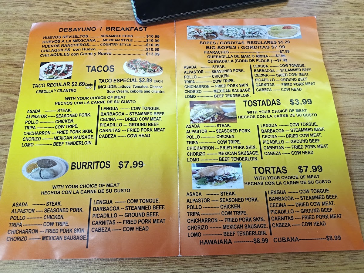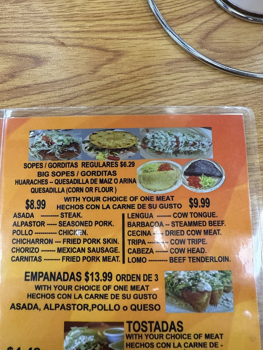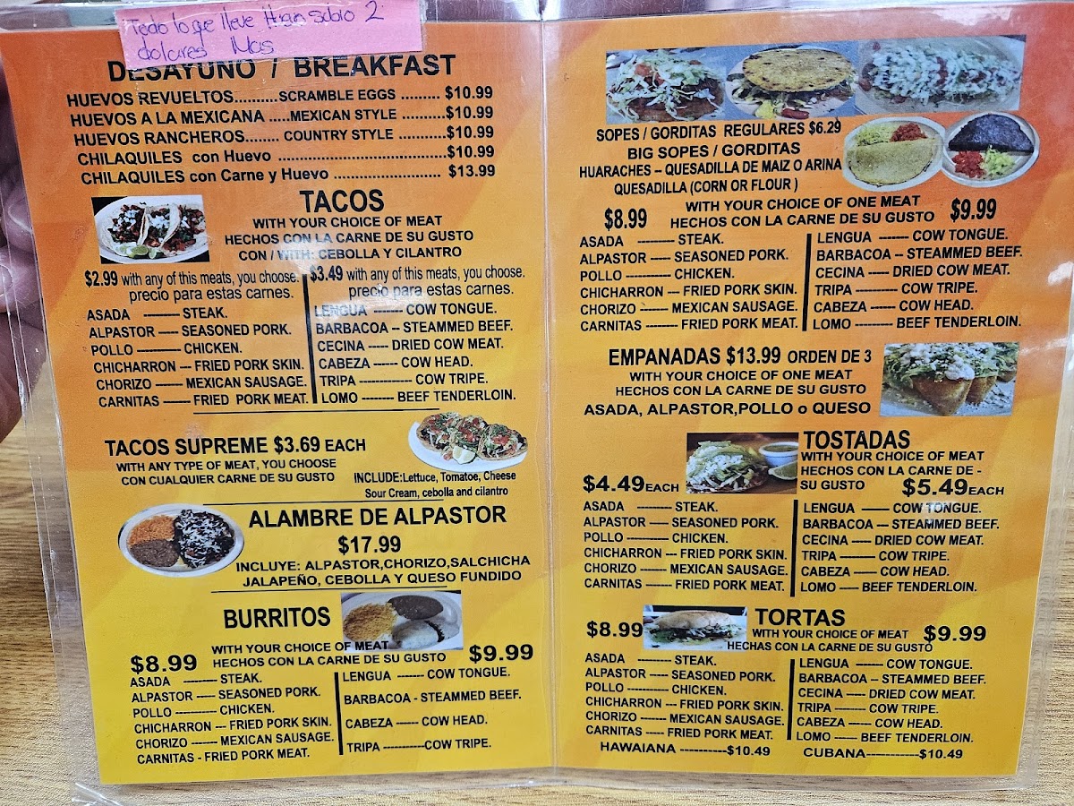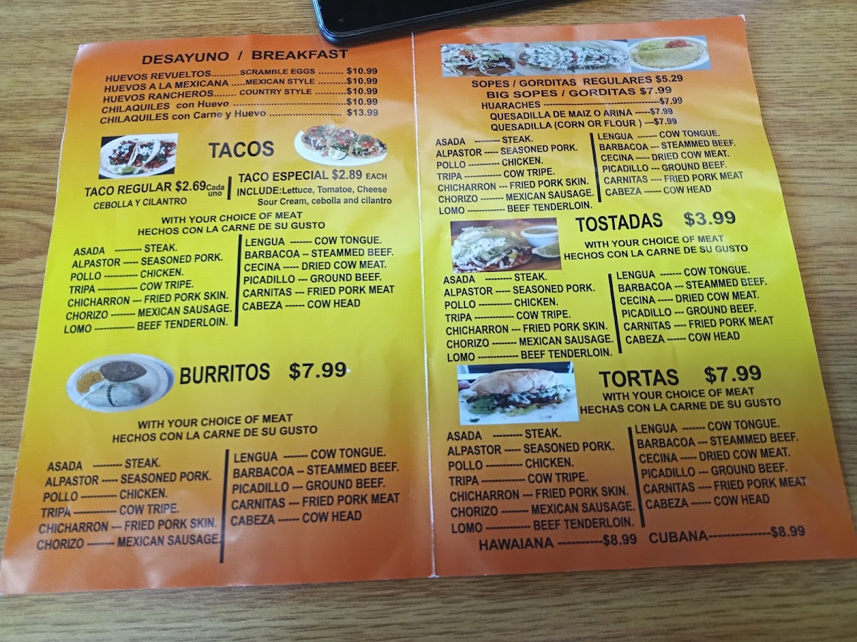 Comes with any type of meat, you choose. Con cualquier carne de su gusto. Include: Lettuce, tomatoes, cheese, sour cream, cebolla and cilantro.