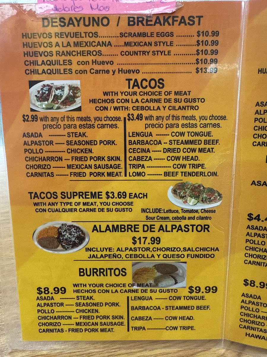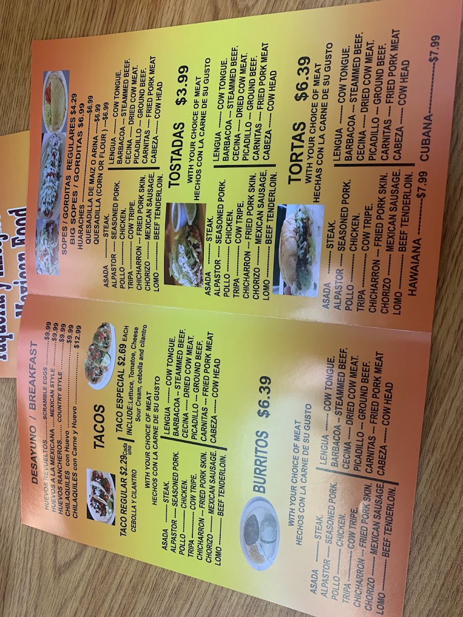 Asada pastor pollo chicharron carnitas tripa cecina lomo cabeza y lengus