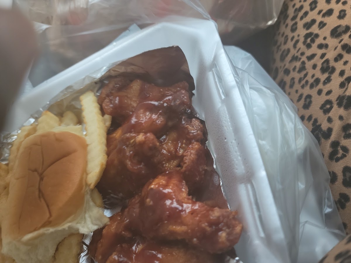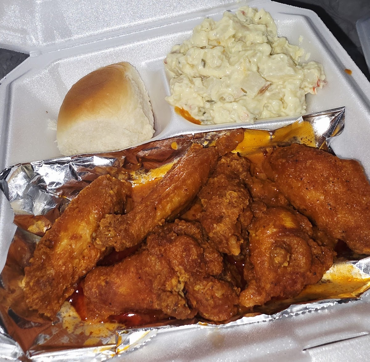 The food isn’t bad the fried whole wings so small and the seasonings taste like lemon pepper and seasoning salt people know cheap food but overall 3.8
