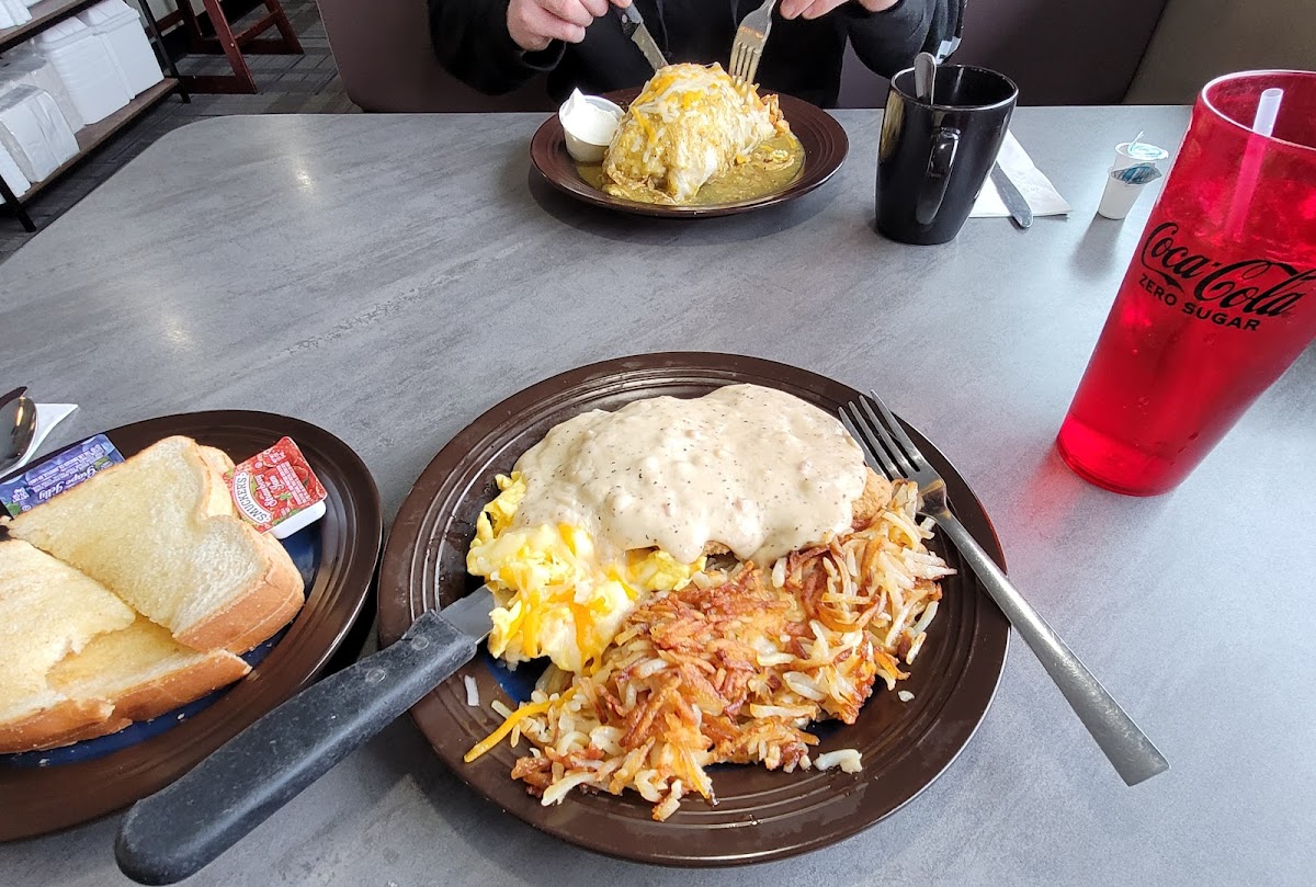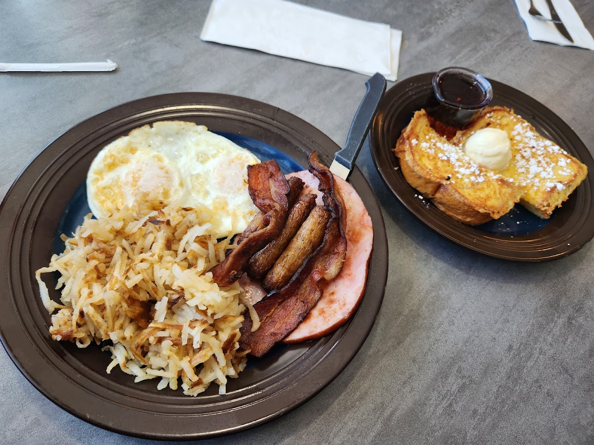 Dropped by for breakfast. Looked very busy and it was 10:00 am. Were greeted by three different people and in our seats in a minute. Very clean and rustic. Nice place. Friendly servers. Fast delivery of the food and drinks. The issues we had were with the food. The country potatoes with veggies were probably very tasty. The vegetables were still raw. The server fixed it quickly with a new batch of potatoes. My hash browns were barely cooked. Just barely browned and barely hot enough. Commented that the short order cook needs to do a stint at the Waffle House! They know hash browns better than anyone. We will return. Many menu items to sample. The service along makes it worth the trip. The eggs were cooked as ordered. The French toast special has more than I could eat and rich with cinnamon. Just wish I could have picked real maple syrup. I can bring my own as long as there is not a corking charge!