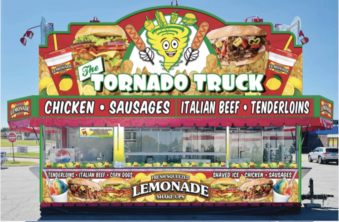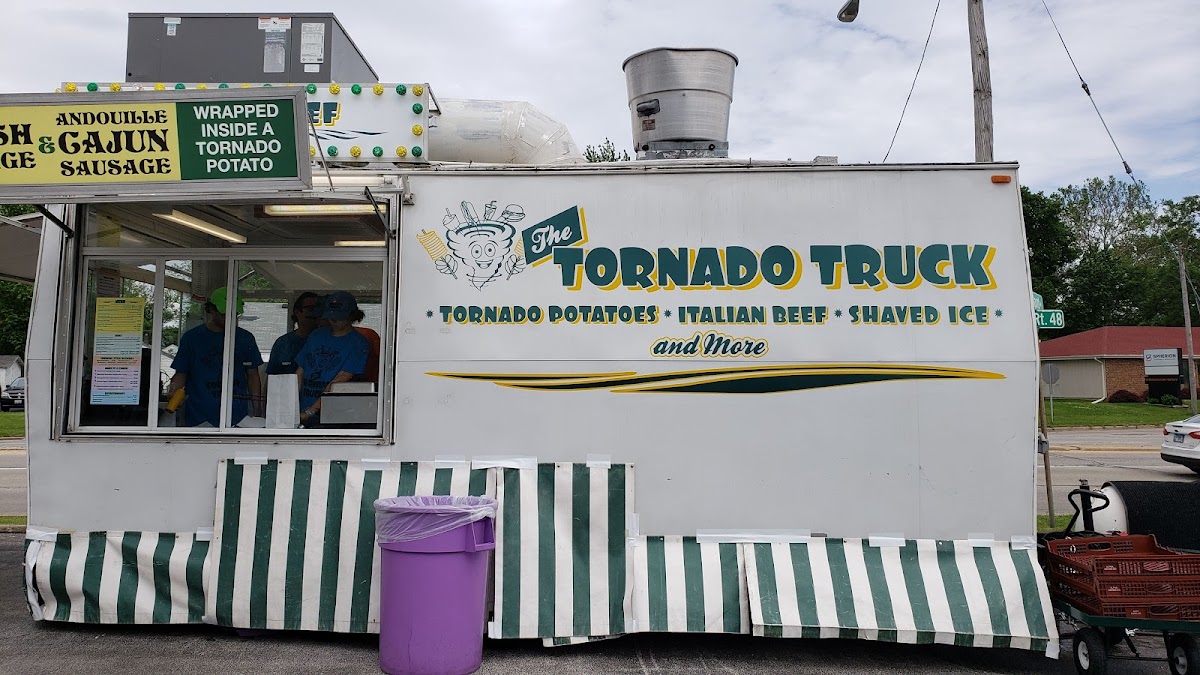The Tornado Truck, located at 1355 N, IL-48, Decatur, IL 62526, United States, has 166 reviews as a restaurant offering various types of cuisine. Highlighted menu items include Dicky's Homemade Italian Beef Sandwich, Jackfruit, Strawberry Lemon Shake Up and Grape Shaved Ice, and Fritto Misto, catering to diverse tastes in a casual venue.