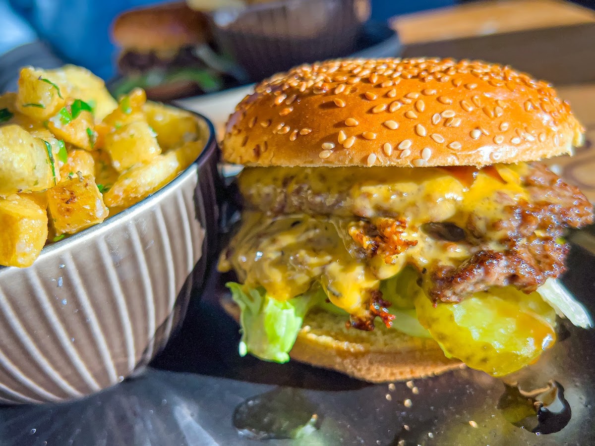Nice location next to a lake with swans, geese & gulls. Nice pint of Madri with warm, friendly service. £16.95 Double smashburger really delivered on flavour and texture and the garlic/Parmesan fries were fantastic! Thoroughly enjoyable lunch…