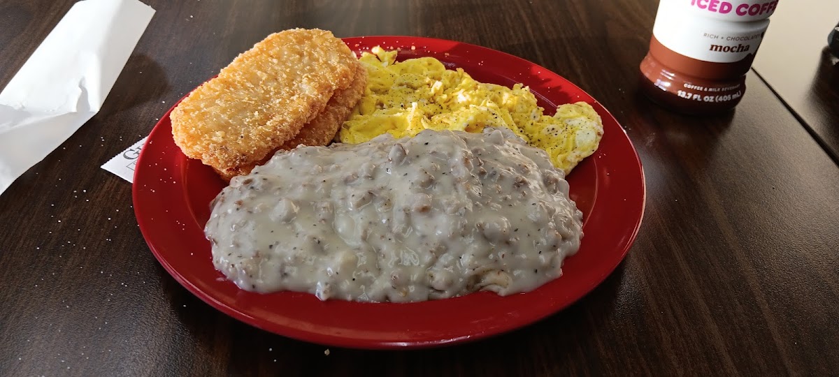 Don't let the fact it's a convenient store fool you. There are tables in a little diner section in the back. I had the sausage gravy and biscuits with scrambled eggs. It was delicious! Certainly better than going to the "Arches" down the street...