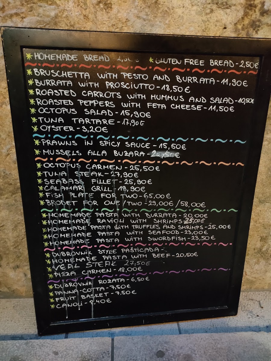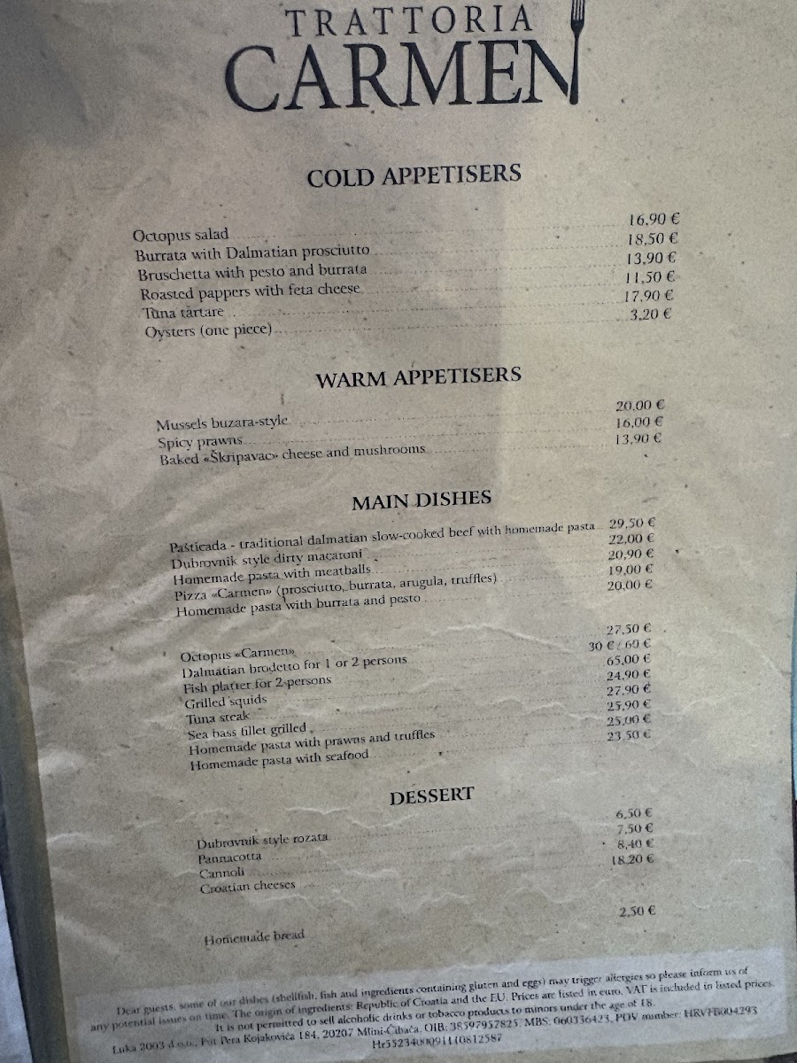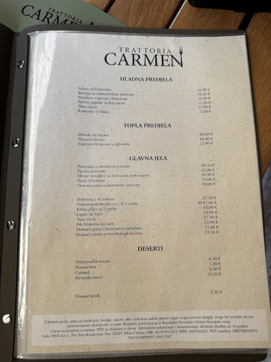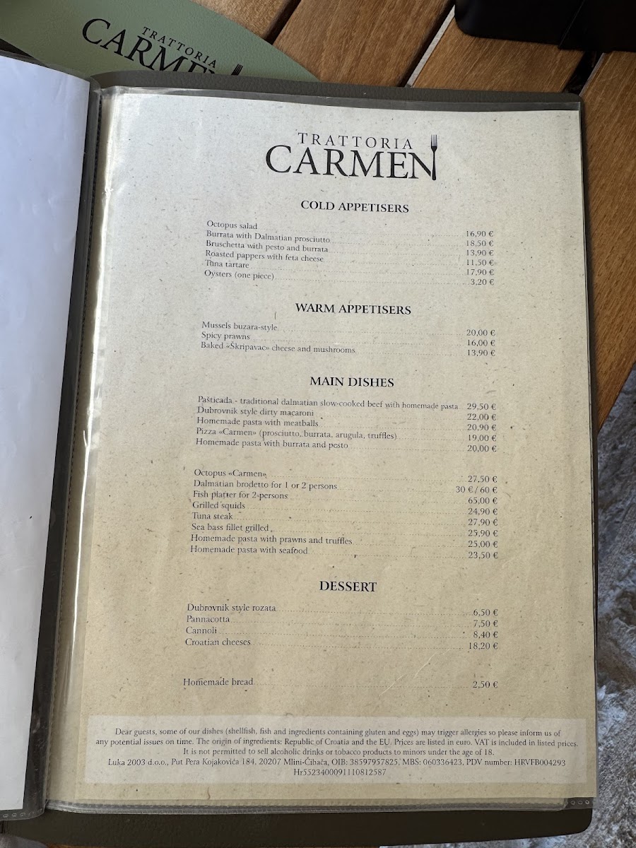 Carmen's menu changes daily depending on the offer on local fish and green markets. Below are the examples of our delicious specialities.