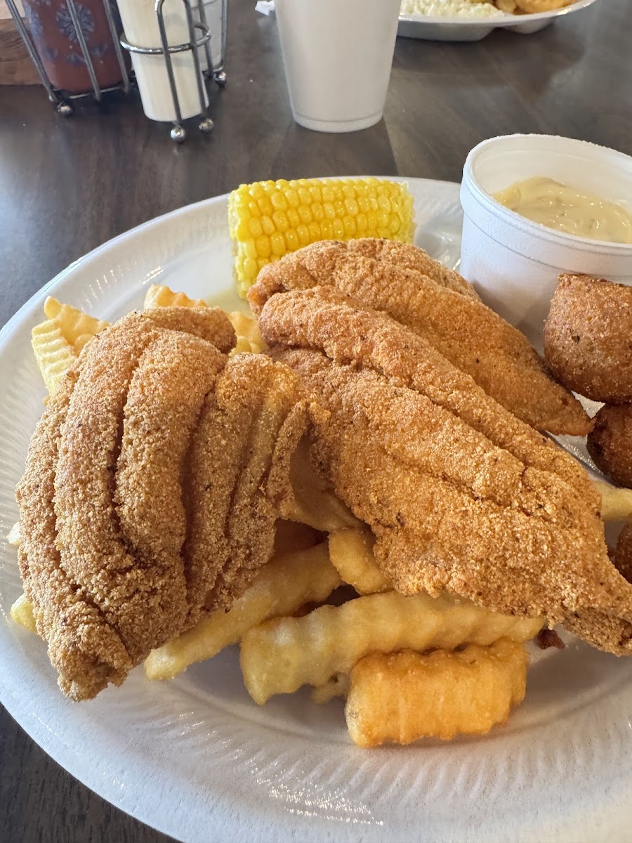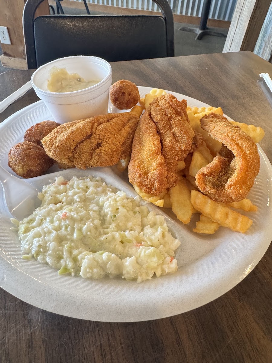 It’s a hole-in-the-wall in North Carrollton. The walls are corrugated metal. Bible verses adorn the walls and other decor. They only have fish in fridays! What’s not to love!!! The fish is crispy, fried, cornmeal seasoned and good. The fecundities are salty and crispy. The Cole slaw and tartar sauce are mayonnaise-y (in a good way). They have sweet and unsweetened tea for those of you who are sweet enough already. Service is good and not pretentious. The restroom is clean. Other items in other days and will review those on another occasion.