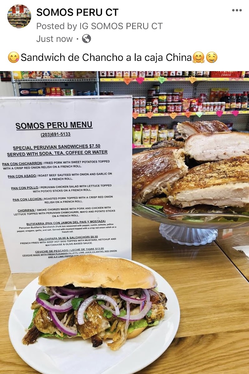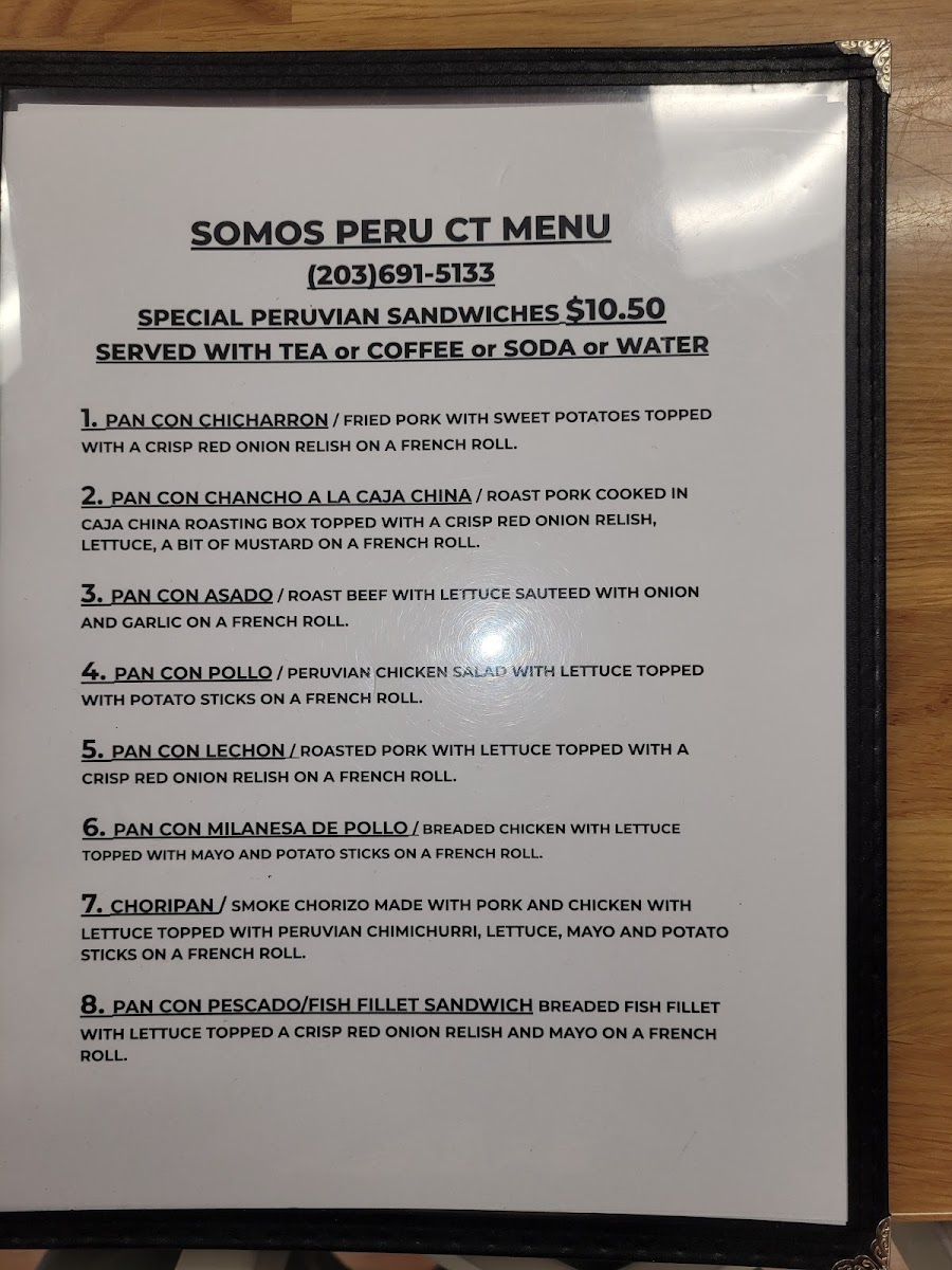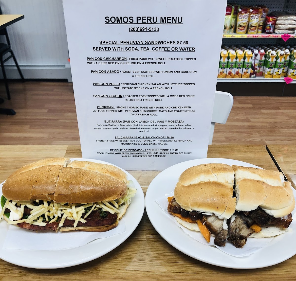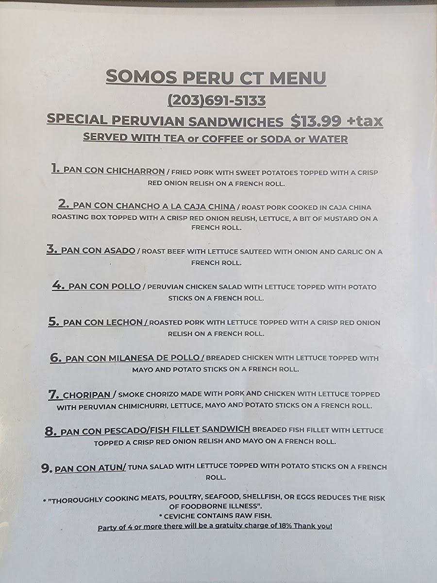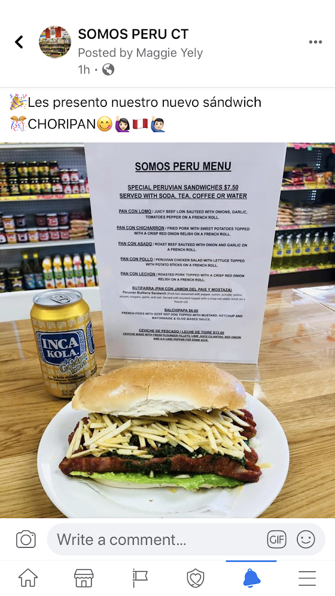 Smoke chorizo made with pork and chicken with lettuce topped with Peruvian chimichurri, lettuce, mayo, and potato sticks on a French roll.