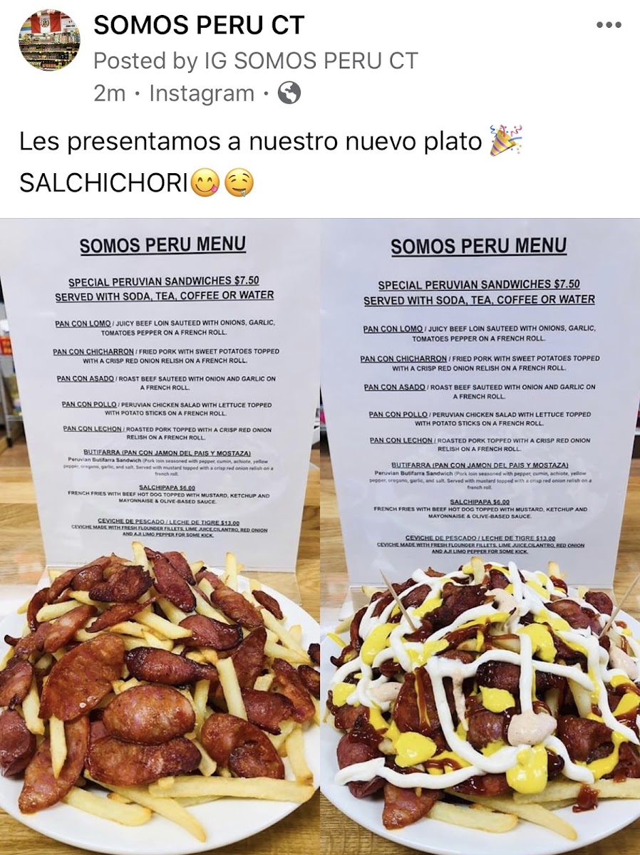 French Fries with beef hotdog and smoke chorizo (made with chicken and pork) Topped with mustard, ketchup and mayo.