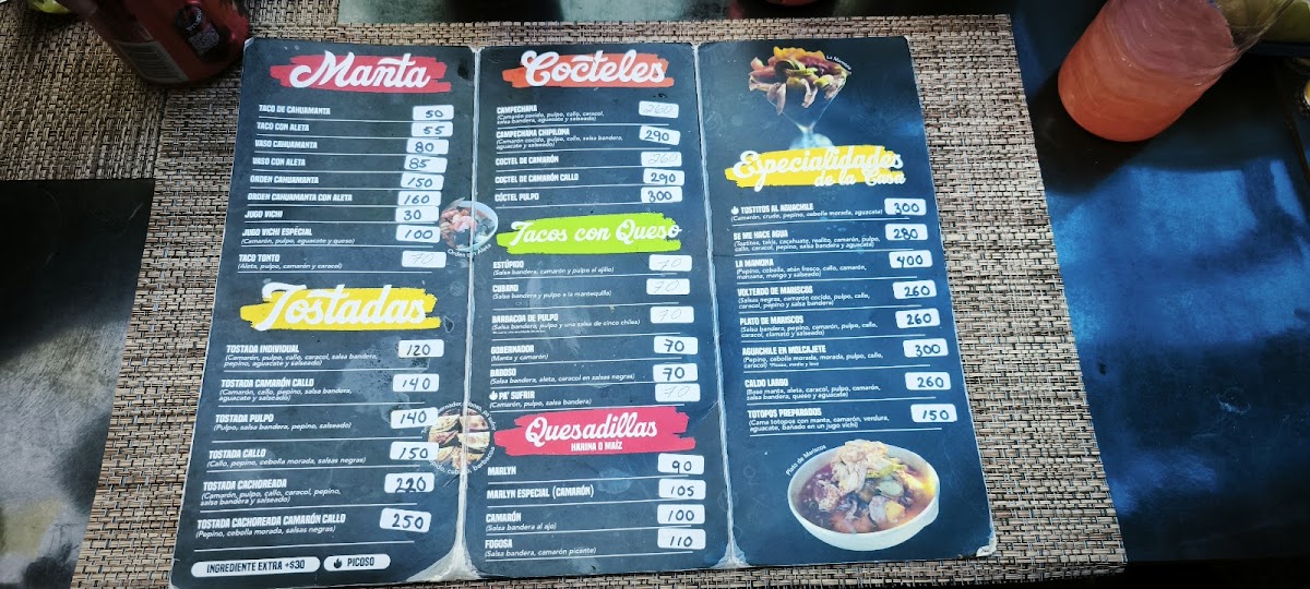 Tostada de camarón con pulpo, callo, caracol, pepino, aguacate, salsa bandera y de la casa.