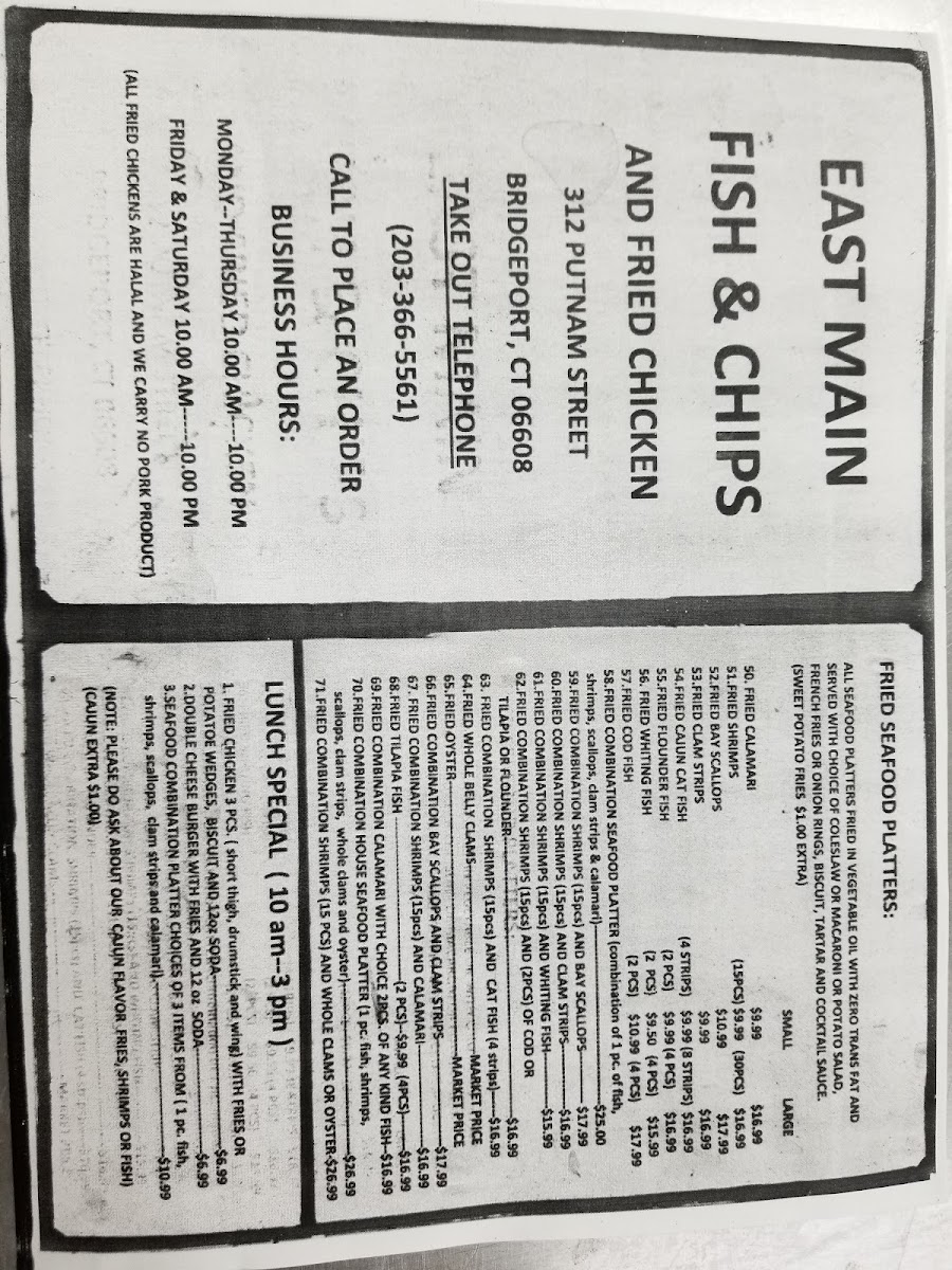 I've been a fan since the mid 90s when it was on Boston Ave. The seafood platter is still the same. Although I live in NC now and have for quite a while, I always make it my business to get my fix and see my long time friend. The best fried shrimp anywhere in CT. No one tops East Main Fish and Chips... it's hard to believe you can afford to eat so good when your living on a budget. One of Bridgeport's best kept secrets and hidden gems.