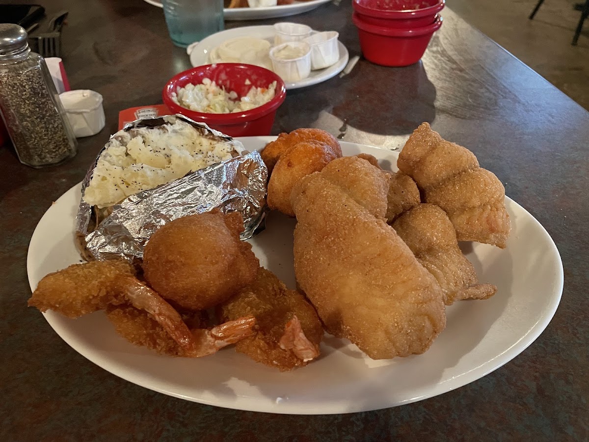 Surprisingly good burgers, fries, onion rings. Popcorn shrimp if good. Catfish and traditional sides are very good. It’s not fancy, but they put out some good food.