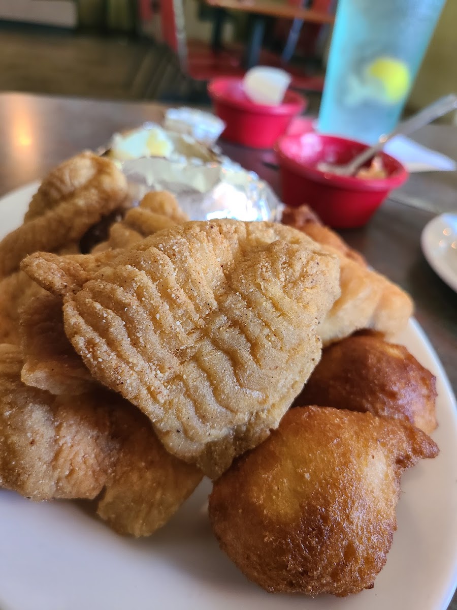 This little gem was everything — and so much more than I could have ever imagined! The drive to get here alone is breathtaking, and the restaurant itself feels like a peaceful reward at the end of the road. We ordered the full order catfish fillet, the special of the day (grilled chili tilapia), and two desserts — the homemade hot fudge cake and the pecan pie. As for the desserts, while both were delicious, the pecan pie stole my heart. It was truly the best pecan pie I have ever had in my life! Now, the catfish fillet… OMFG — perfectly golden, crispy on the outside, tender on the inside, seasoned with love. Just heavenly. And I can’t forget to mention the hush puppies! For those who don’t know, hush puppies are deep-fried cornmeal balls — crispy on the outside, fluffy and soft inside — a Southern staple that you simply have to try. Honestly, after tasting these, I’m inspired to try making hush puppies at home (though I’m sure they won’t come close to these). Learning the history of Fish Camp made the experience even more special. Back in 2010, during the devastating floods, this entire place was underwater. They had to rebuild everything from scratch. Standing there today, it’s hard to imagine this place ever not being here — it’s truly a blessing it still is. It’s more than a restaurant; it’s a story of resilience, community, and love. On top of the amazing food and the heartwarming atmosphere, the parking lot area is so beautiful that it turned into an unexpected dreamy photoshoot location. And as a cherry on top, we met the adorable geese couple who come back every year with their new babies! An employee even let us feed them — a simple but unforgettable moment that made my heart so full. I will forever return for the catfish, the hush puppies, and the pecan pie! Thank you, Fish Camp, for giving us not just a meal, but an experience I will cherish forever.