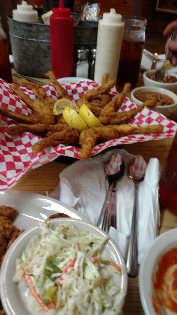 Food was ok, fried green bean app was great. Ordered 8 oysters, they were kind of small, but there was 11 of them on my plate. Service was good; waitress was efficient but needs some people skills. Catfish was really good; Cole slaw tasted like the walk-in. All in all, an ok place to eat with some room for improvement. I was going to give them 3 stars, but gave them the benefit of the doubt, considering that we were seated at 2:30.