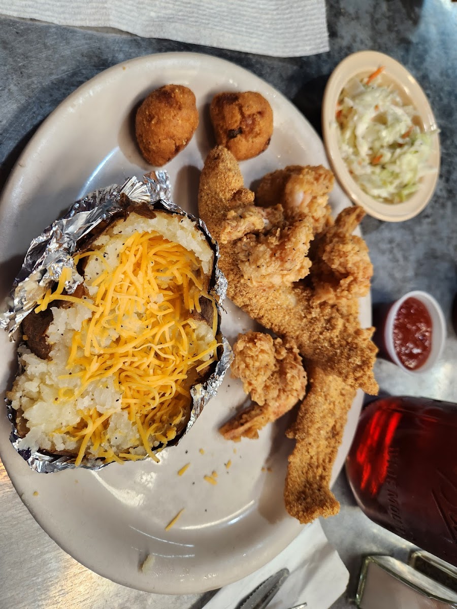 This was our second visit to Hushpuppies in their new location. Everything was really good. We started out with boutin balls. They were fried crunchy on the outside and we loved the sauce that came with them. We got the catfish & shrimp platter. My husband raved about the fish the next day. The filets were nice and meaty and perfectly seasoned and fried. The shrimp was awesome, too. I had a baked potato as one one of my sides which I really enjoyed. We get to visit when we visit my Mom, or we would be eating here every week. Great service, too!!