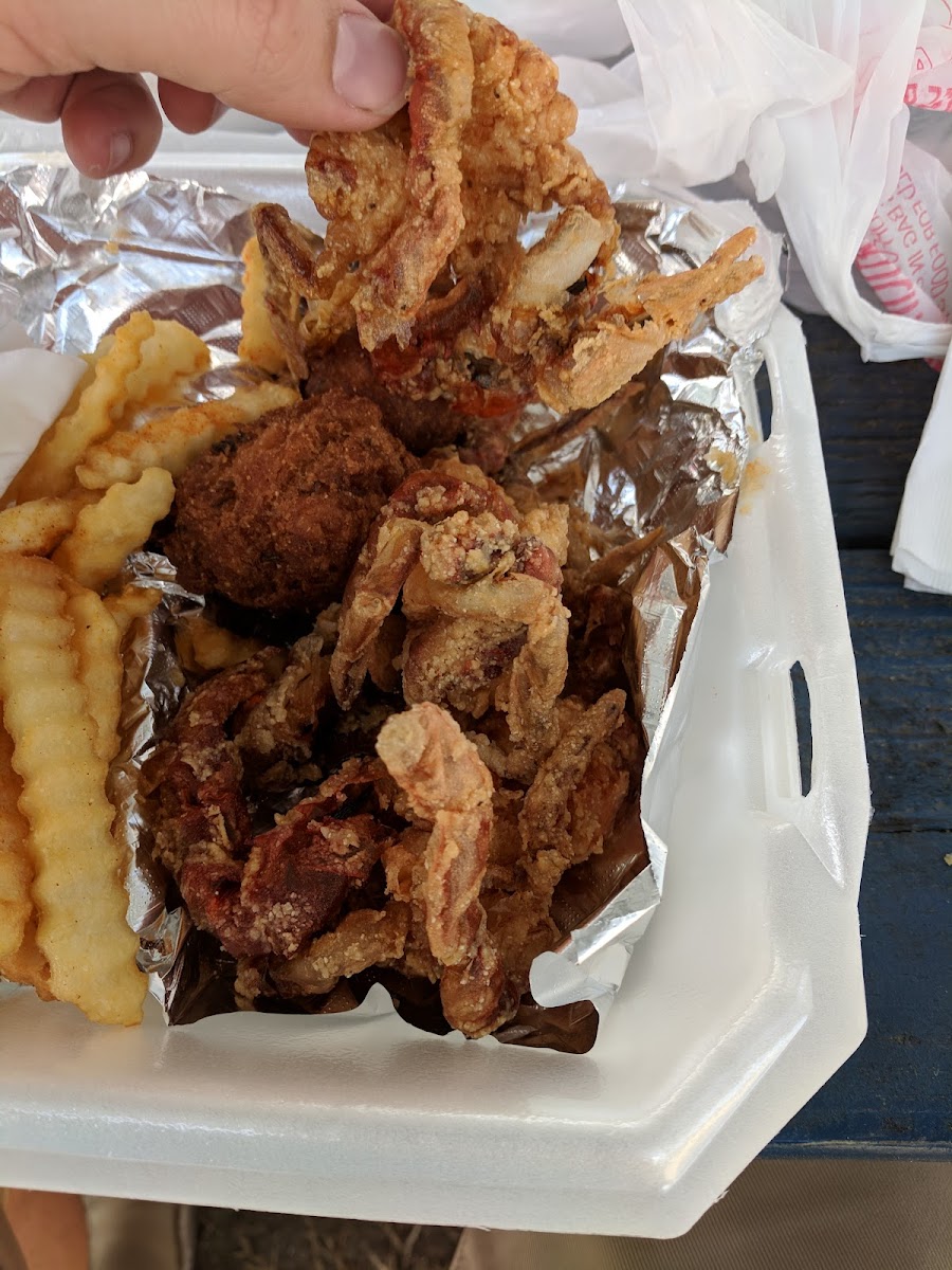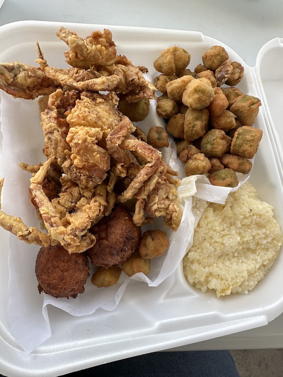 The food was delicious and they give you a lot!!! I had 2 soft shell crabs and about 12 fried shrimp, fries, hushpuppies and cheese grits. My husband had the same but instead of shrimp he had the clam strips. We both loved the flavor of the food.