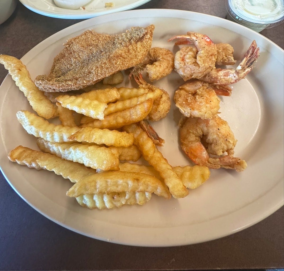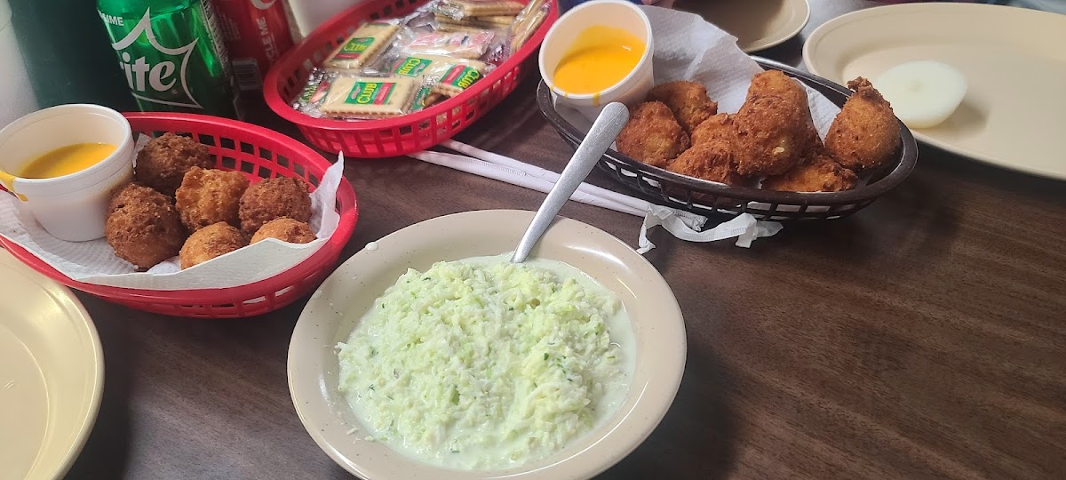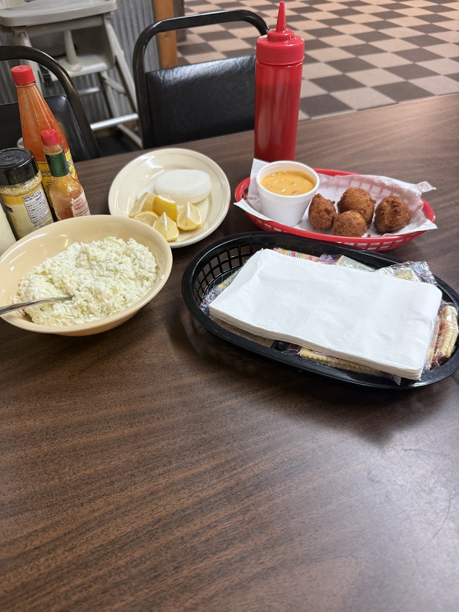 The waitress and the owner of the restaurant were so nice. The food was delicious and the Cole slaw and hush puppies were homemade and absolutely delicious, and they were all you can eat for FREE!! They also give you a pitcher of what ever you order to drink, so you don’t have to wait for refills. You don’t see that anymore!