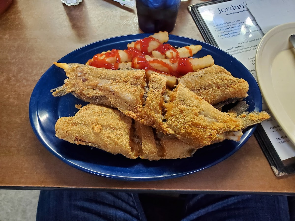 Jordan's Fish Camp is located at 694 US-45 in State Line, MS, and is a well-visited seafood restaurant with 684 user reviews. Their standout dishes feature Cole Slaw, Hush Puppies with Cheese Sauce, Fried Catfish and Fries, All You Can Eat Catfish Platter, and Sad Shrimp and Fish Platter. Mondays can be busy with wait times up to 30 minutes between 1:00 PM and 3:30 PM, while Saturdays and Sundays offer no wait at all, making weekend visits potentially more relaxed.