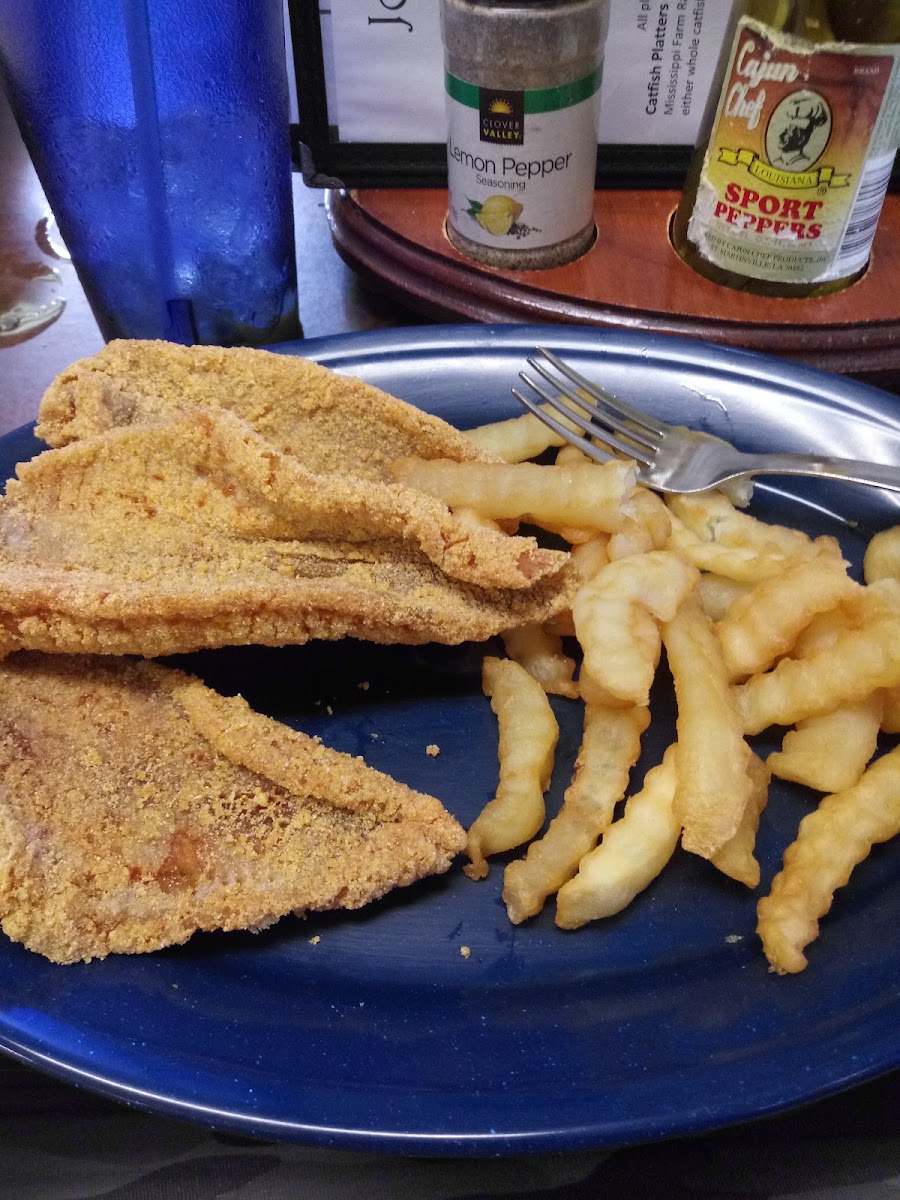 The food and service was great. The only reason I’m leaving 4 stars instead of 5 was because my meal was a little pricey. I got two fillets which comes with coleslaw and hush puppies. I also got a sweet tea. After a $3 tip, my meal was close to $25. That was just a whole lot more than I was hoping to pay. The fish was good and I really do appreciate that it’s pond raised in MS and not Swai. Also really liked that they left a whole pitcher on your table to refill your own drinks when you like.