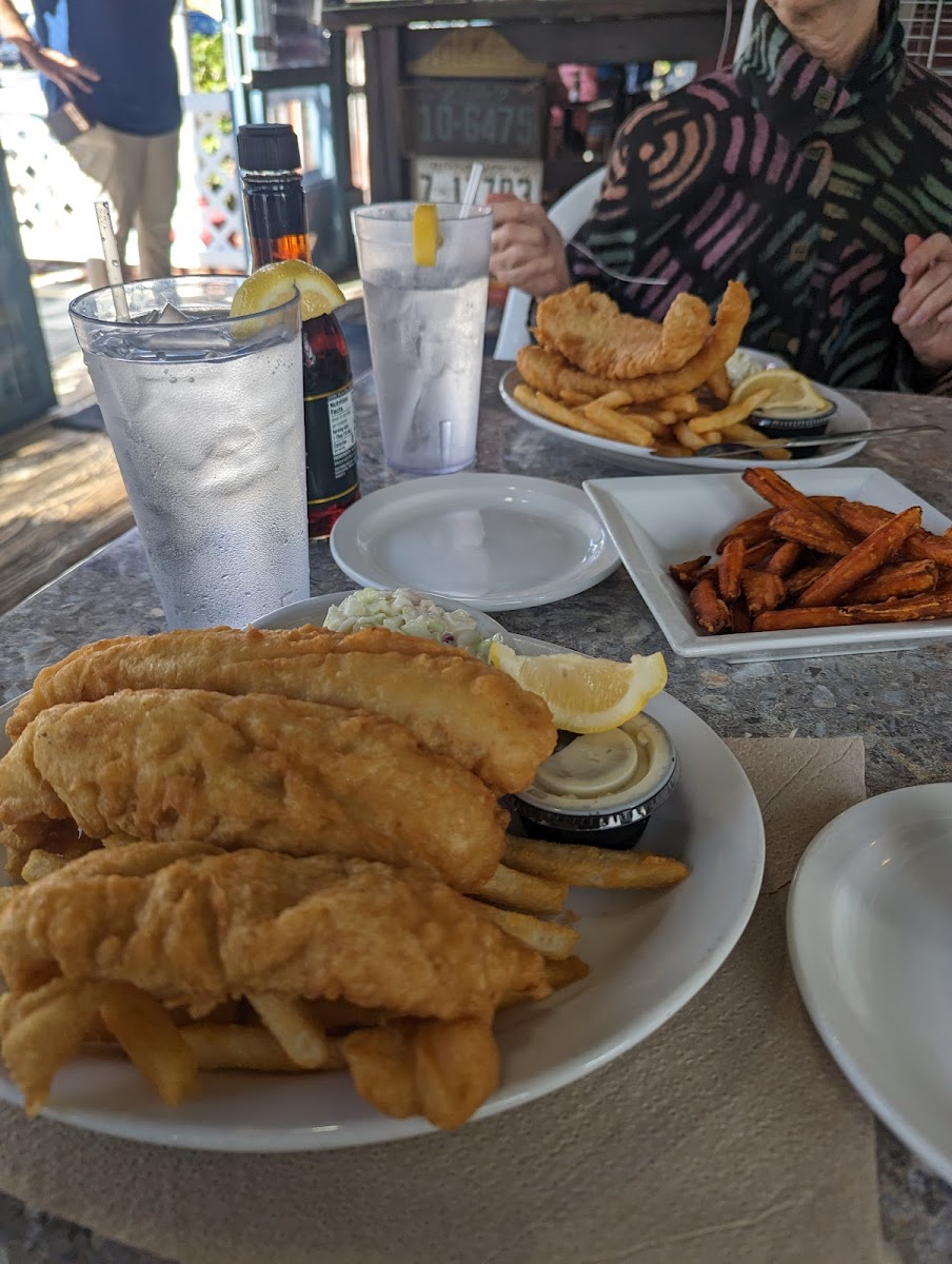 Such a fun vibe! Ozona is cute and this definitely feels like key west. Fish and chips were delicious (careful: fresh out of the fryer and super hot!) as were the blackened mahi tacos. Definitely get the mango salsa and cilantro cream sauce on the side!