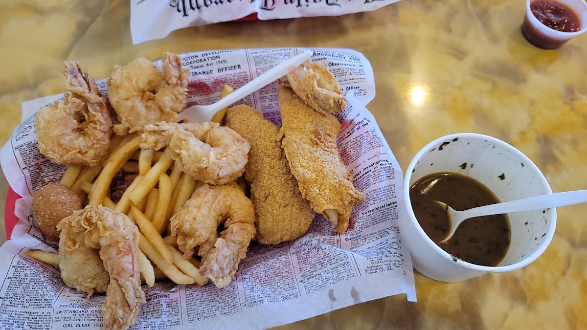 Don't let this place fool you. On the outside, it doesn't seem like a seafood place but that's EXACTLY what it is! We had the fried sampler, which feeds 4. The shrimp, fish, and chicken were all cooked to perfection with excellent flavors. The hush puppies, french fries, and slaw were delicious too. And the price.... ALL of that food and 4 drinks for under $50 with tip. Wonderful!